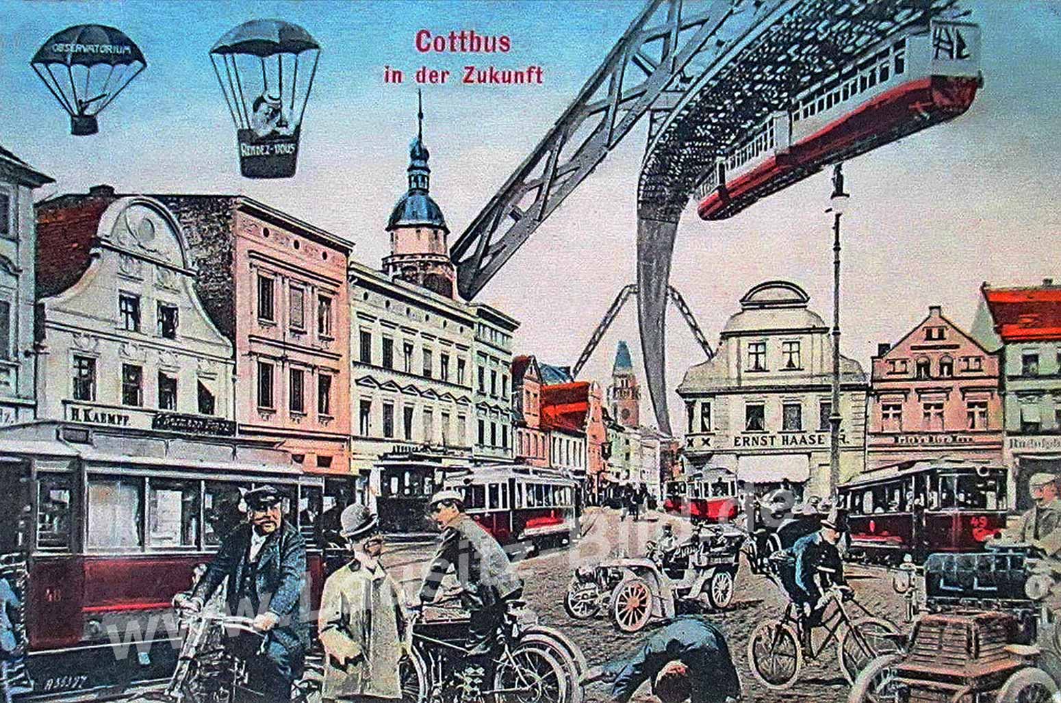 Im ersten Jahrzehnt nach 1900 tauchte in Cottbus eine futuristische Postkarte auf, auf der in Jules-Verne-Manier die Stadt in der Zukunft dargestellt wurde.Unter OB Werner hatte Cottbus einen enormen Entwicklugssprung gemacht. Allein vun1890 bis 1910 verdoppelte sich die Einwohnerzahl. 1903 wurde das Elektrizitätswer in Betrieb genommem, was die "Elektrische" (so nannten die Cottbuser liebevoll ihre Straßenbahn) möglich machte. Alles schien machbar alles schien möglich. So ist es nicht überaschend, das auch solche Postkarten auftauchten und sogar die Möglichkeiten anderer Städte für Cottbus aufzeigten: hier die Wuppertaler Schwebebahn. Bemerkenswert ist auch die Anzahl der abgebildeten Straßenbahnen: offensichtlich sah der Blick in die Zukunft auch eine höhere Taktzahl der Staraßenbahnfarten vor.