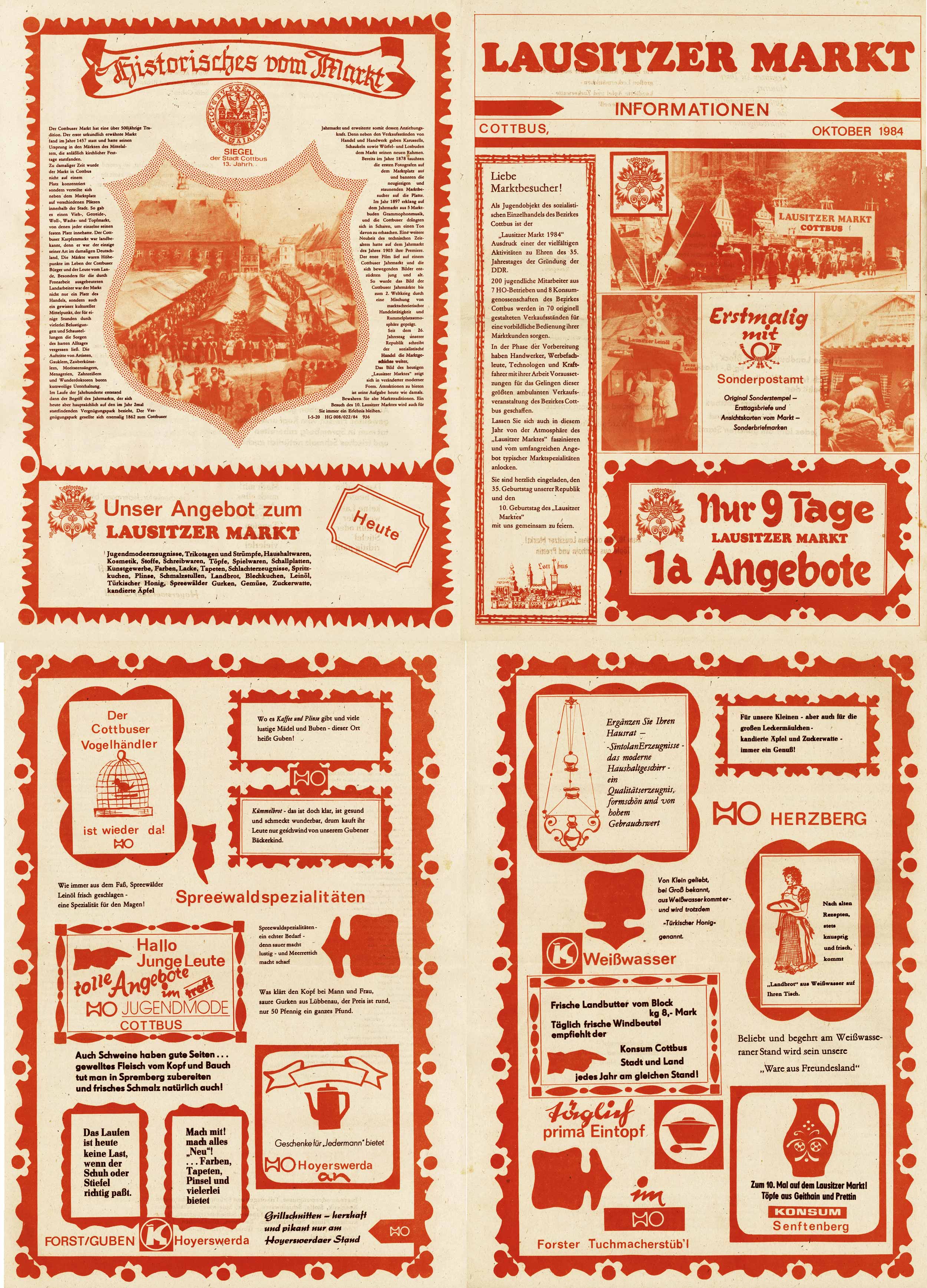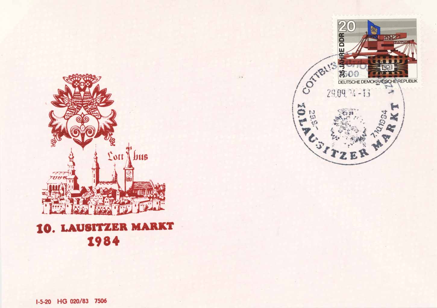 1984 war die Situation in der DDR so, das man unter der Hand munkelte, sie sei nicht mehr zahlungsfähig bei der Bedienung der Zinsen der internationalen Krediten. Genaueres wusste keiner, doch die Versorgungsdefizite bei den Konumgütern wurden immer sichtbarer, weil gerade hochwertige Konsumgüter unter Wert in den Westen exportiert wurden; alles um die begehrten Devisen zu erwirtschaften. So geriet die Wirtschaft der DDR immer weiter in Schieflage. Um den Mangel zu überdecken wurde jeder Betrieb verpflichtet, neben seinem Haupsortiment auch gefragte "Nebenprodukte" herzustellen. Das klappte mal mehr und mal weniger gut. Gute und wichtige Produkte waren begehrt und damit Selbstläufer. Weniger nachgefragte Konsumgüter wurden in einer neuen Form der verschiedener Märkte vertickt werden. Ob Weihnachtsmarkt, Früjahrsmarkt, Sommer- oder Stadtfest und Herbstmarkt - je schlechter die Zeiten, je vielfältiger die Feste. So auch hier, wo mit Erstagsbriefen für den 10 Lausitzer Markt geworben wurde. Oft waren es lokale Briefmarkenfreunde, bspw. vom Kulturbund der DDR die sich für solche Editionen einsetzten und diese organisierten. Paralell versuchte sich die regionale Zeitung "Lausitzer Rundschau" mit einem Sonderdruck, damals etwas ungeübt in der Werbung für den Lausitzer Markt.
