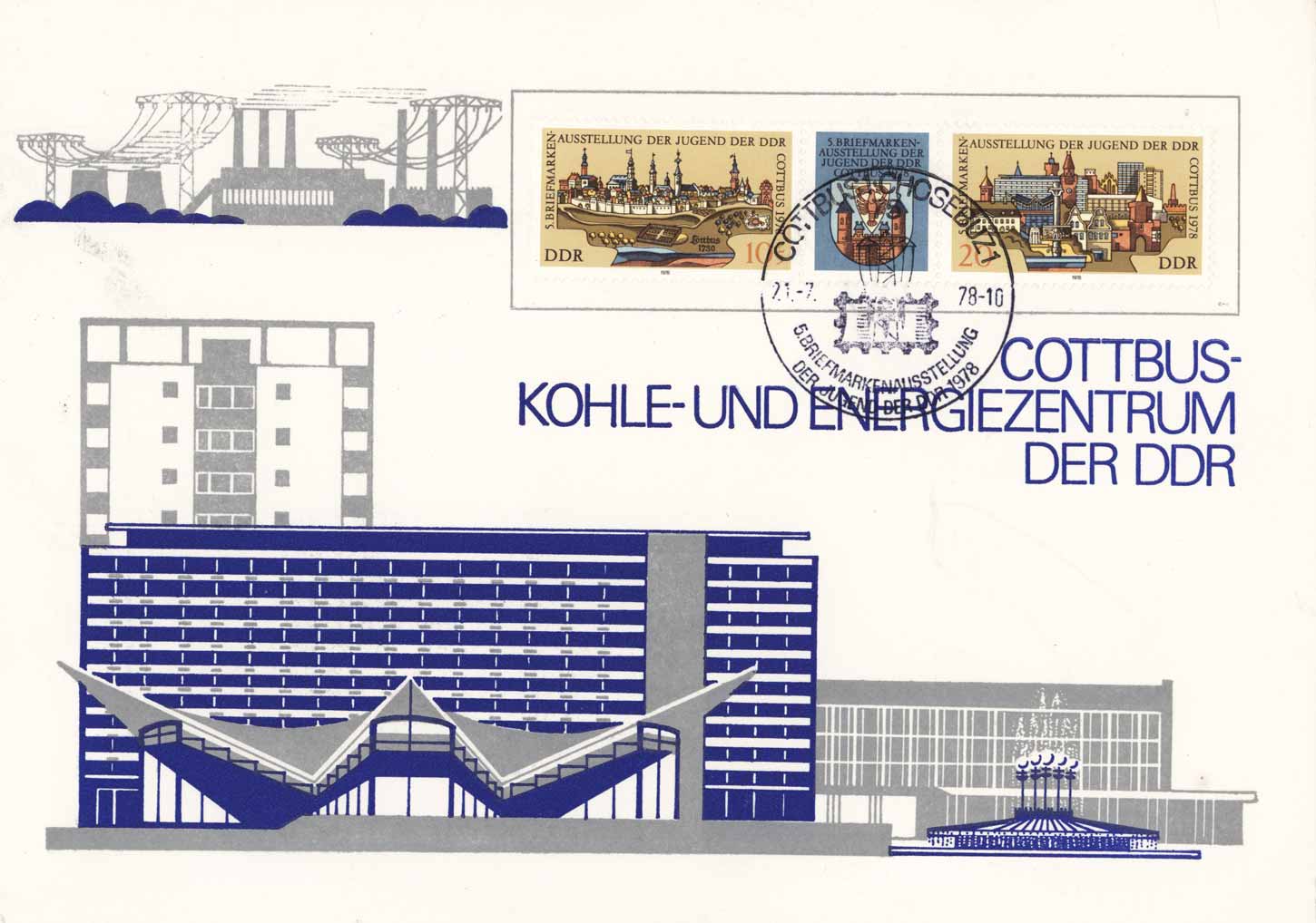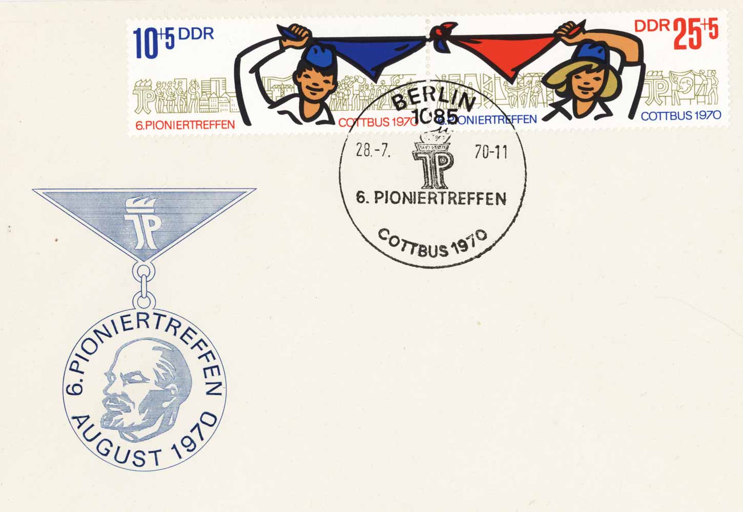 Der oben abgebildete, egentlich unspektuläre Erstagsbrief hat für mich eine besondre Bedeutung. er erinnert mich an einen Tag meiner ersten Sommerferien. Ich wohnte damals im 20km entfernten Kleinstädchen Vetschau. Mein Vater (aus dessen Bestand dieser Erstagsbrief stammt) hatte beruflich in Cottbus zu tun und lud mich an einen herrlichen Sonnetag in seinen Betriebswagen und fuhr mit mir nach Cottbus. Dort fand gerade das 6. Pioniertreffen statt. was für ein Ereignis für mich als siebenjährigen Jungen. Ausgestatte mit 5 Mark der DDR (für ein Mittagessen in disem Fall eine Bockwurst für 0,85 Pfennige) erkundete ich ddas gerade neu gebaute Stadtzenrum rund um die Stadpromenade von Cotbus. Die aufstrebende Bezirksstadt präsentierte sich bei strahlenden Sonnenschein selbstbewusst als Zenrum der Kohle- und Energiewirtschaft. Die Innenstadt strahlte als Stadpromenade brandneu und war erfüllt mit vielfältigen Aktivitäten, die für alle ohne Obulus erlebbar waren. Das gerade geschaffene "Hotel Lausitz" war Quartier für Pioniere aus der ganzen Republik. Das Cafe "Kosmos", von anfang an von den Menschen liebevoll "Sternchen" getauft, war dicht umlagert und ein halbes dutzend Springbrunnen sprudelten ein wenig Kühle in den Sonnentag. Natürlich waren einige Veranstaltung ideologisch angehaucht, aber für mich als Kind war alles großartig, verbreitete Aufbruchstimmung. Alles war machbar, die Zukunft schien rosig und der Sozialismus wird siegen. Das für den Traum der neuen Welt ganze Straßenzüge historischer Bauten geopfert wurden, begriff ich erst viele Jahre später. An jenem Tag war alles in Ordnung, der Sozialismus mein Ding.