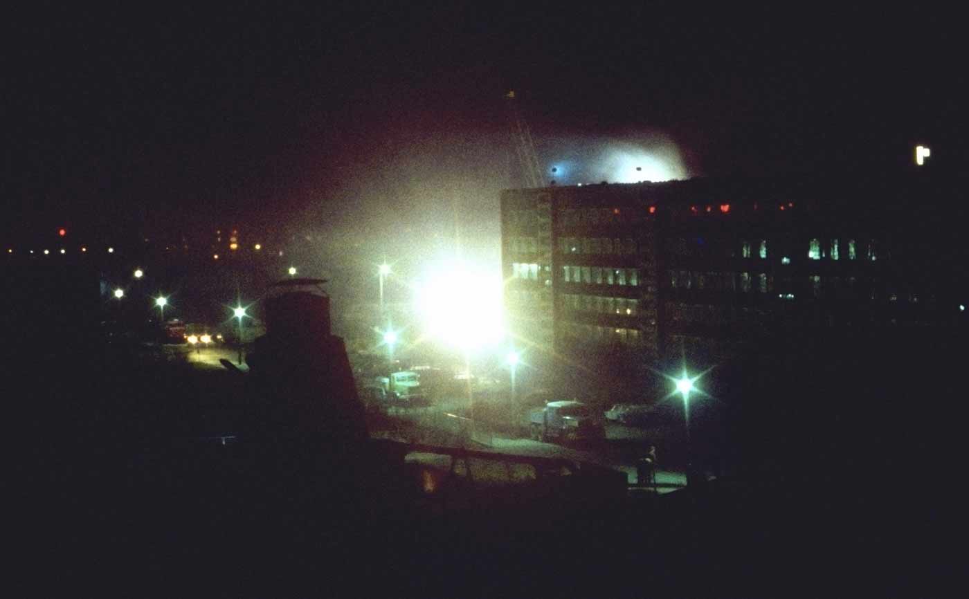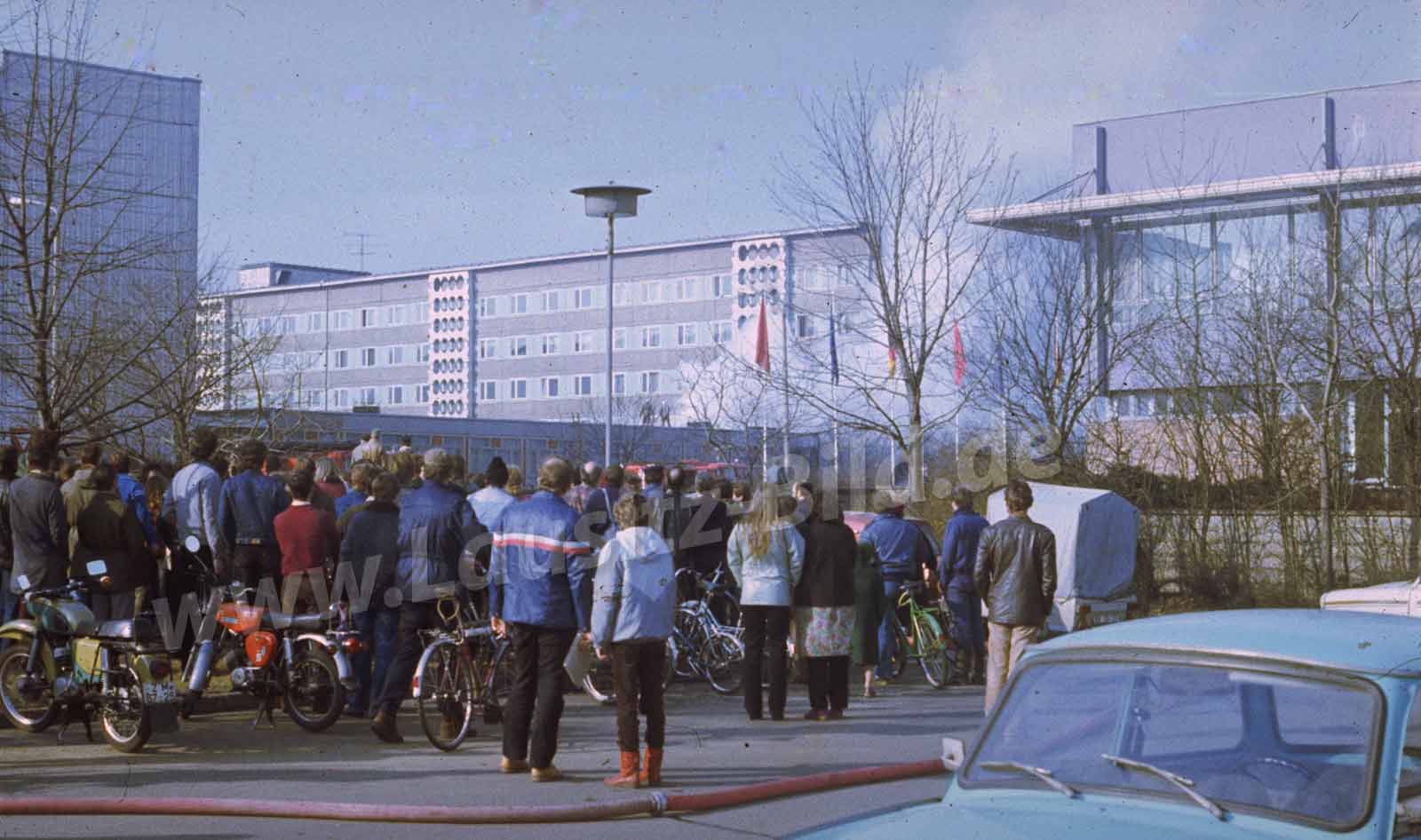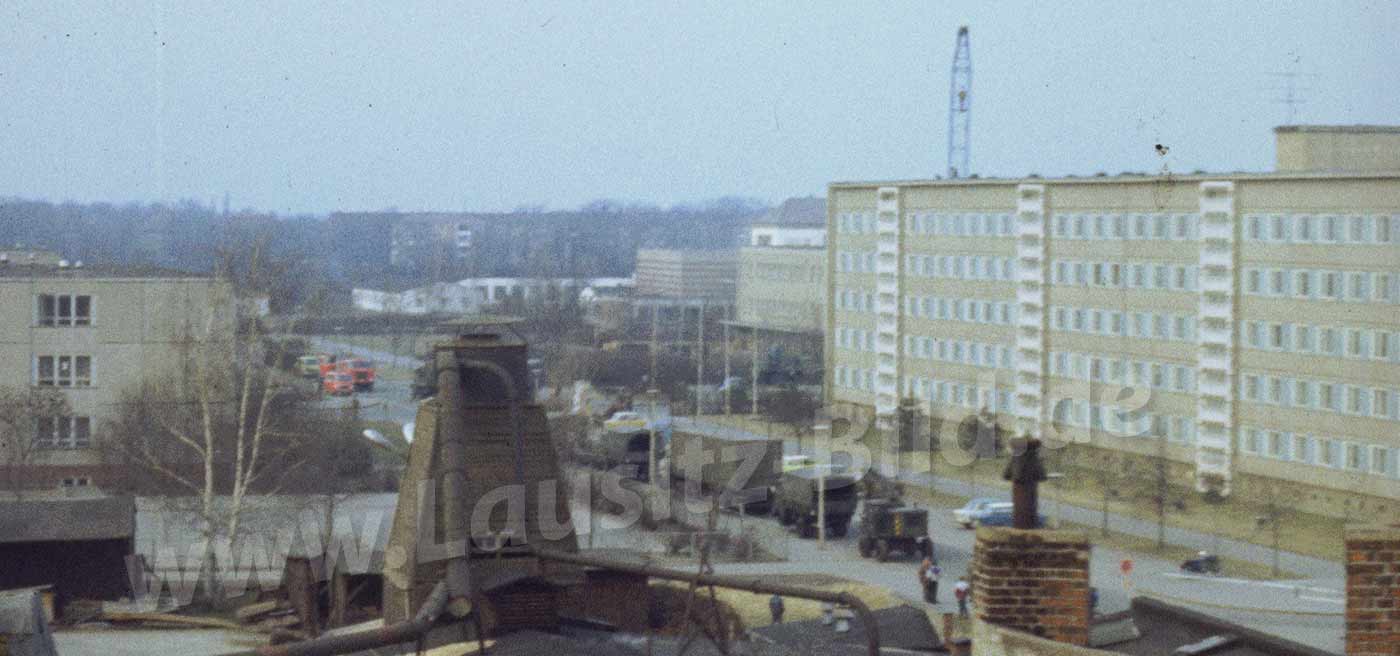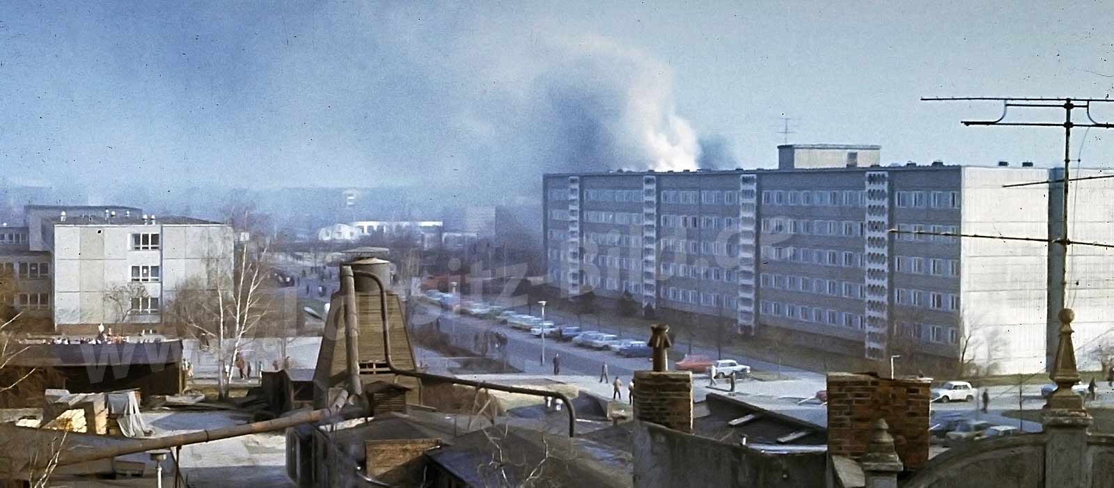 Es war ein herrlich sonniger Frühlingstag und weil Sonnabend war konnte ich ein wenig länger ausschlafen. Ich wohnte noch in der Frankfurter Straße im 6. Stock eines Plattenbaus. Um 08:46 Uhr wurde ich unsanft mit einen lauten Knall aus meinen Träumen gerissen. Noch schlaftrunken riskierte ich einen Blick aus dem Fenster, weil ich den Knall nicht einordnen konnte. Ich erblickte ein schwarze Rauchwolke die irgendwo zwischen dem Internatsbau III der Fachhochschule und der Studenten-Mensa aufstieg. Von da ging alles automatisch. Gerade von der Armee gekommen hatte ich noch Übung im schnell-anziehen und griff meine, auch gerade von meinem Vater vererbte Kamera (Praktika L). In dieser steckte noch ein Orwo Negativ-Film NC-20 mit gerade mal 6 freien Bildern. ´Besser als nichts`dachte ich mir, machte das erste Bild aus dem Fenster und stürmte los, in Richtung des Geschens. Auf der Straße angekommen, waren noch gute 200m bis zum Zielort überbrücken. Mir fielen wärend des Sprints zwei Dinge auf: Zum Einen färbte sich der Qualm langsam von Schwarz auf weiß - ein untrügliches Zeichen, das die Löscharbeiten schon begonnen hatten. Das war schnell, sehr schnell. Zum Anderen waren neben wenigen roten überwiegend grüne Löschfahrzeuge vor Ort und plötzlich dämmerte es mir: das war die Flugplatzfeuerwehr des Militärs (der Flugplatz lag nur weige hundert Meter westlich der Unglücksstelle). Das alles konnte nur heißen: hier war etwas vom Himmel gefallen. Instinktiv wurde ich langsamer und schob die Kamera noch weiter unter die Jacke. Nur nicht auffallen, denn neben der Militär-Polizei waren sicher auch einige Stasi-Mitarbeiter aktiviert worden. Wenn ich denen in den Arm gelaufen wäre, würden sowohl meine Kamera als auch das Filmmaterial auf nimmer-wieder-sehen verschwinden. Also kurz die Situation aufklären. Alle Uniformierten waren gut zu sehen und die "Stasi-Zivilisten" waren auch schnell lokalisiert. Es fällt eben auf, wenn sich manche der Passanten nicht für das Geschehen interssierten, sondern eher entgegen gesetzt, zu den Passanten schauten. Trotz dessen gelangen mir vor Ort noch 3 Fotos in einer bescheidenden Qualität, denn ich konnte naturbedingt nur bei Gegenlicht fotografieren. Auch das verdeckte Fotografieren trug nicht unbedingt zur Qualität der Fotos bei. Offen einen ruhigen Blick durch den Sucher auf das Motiv zu richten war unmöglich.
