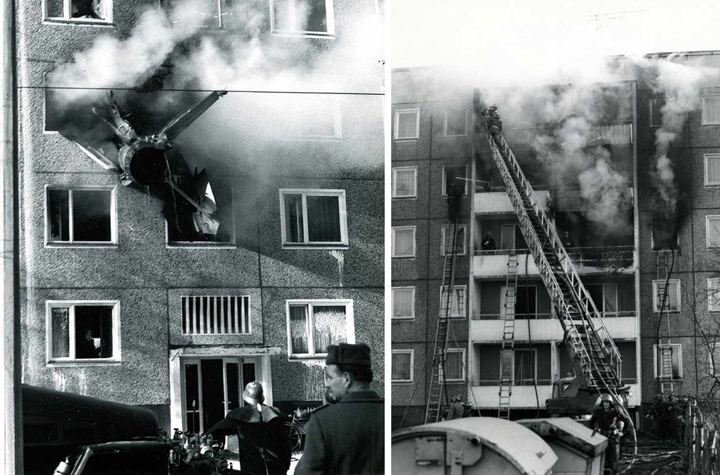 Über 300 Feuerwehrmänner, Mediziner, NVA-Soldaten und Polizisten waren in diesem Einsatz. Die Umgebung wurde hermetisch abgeriegelt. Als die Unglücksstelle zwei Tage später wieder freigegeben wird, ist von der Katastrophe (fast) nichts mehr zu sehen. Nur die mit Waschbeton verfüllte Fassade hob sich als dunkler Fleck dis Mitte der2010er Jahre ab und zeigte die Stelle an, aus der das Heck der MiG ragte.