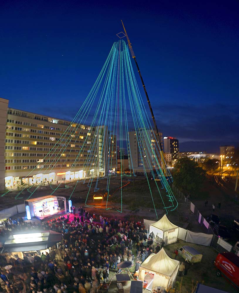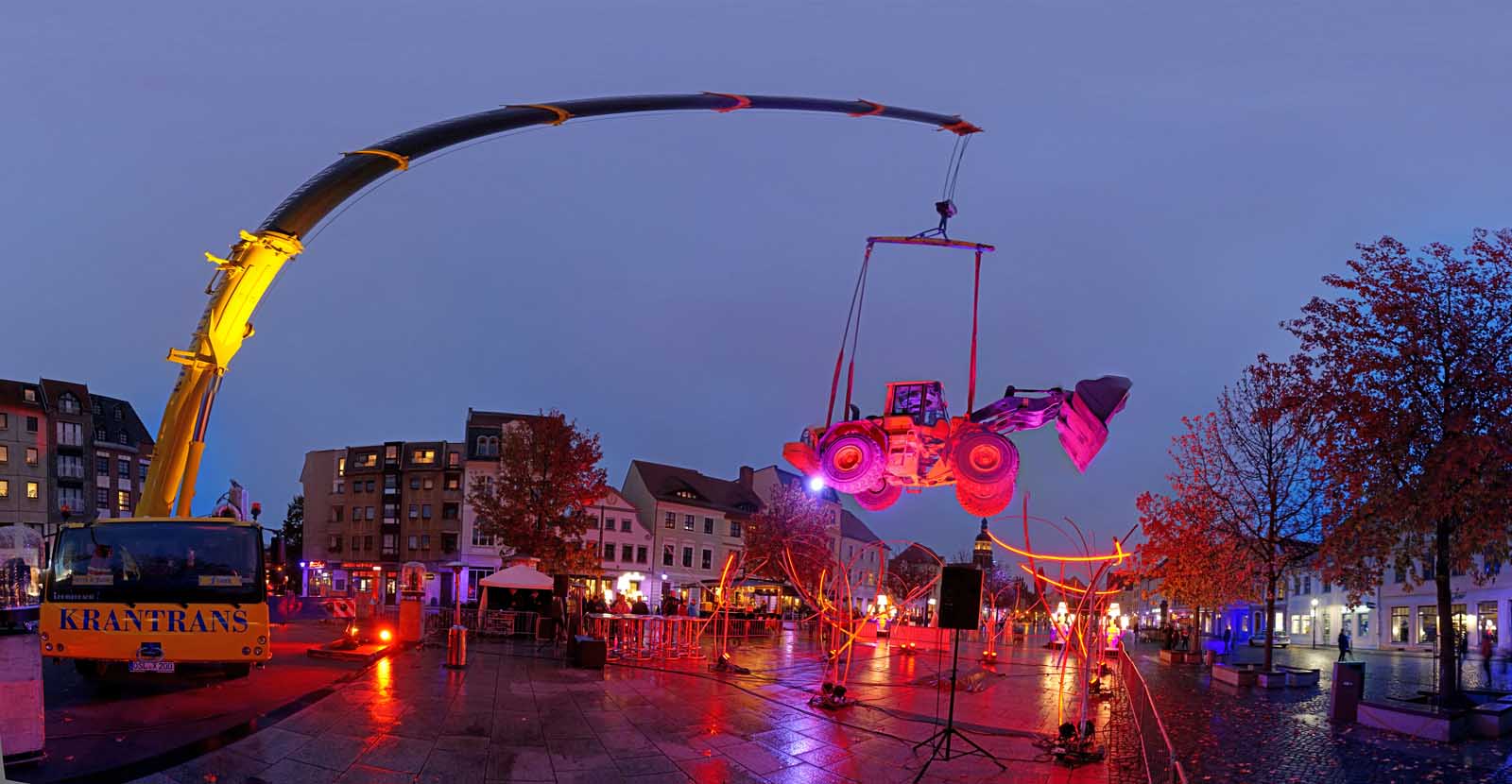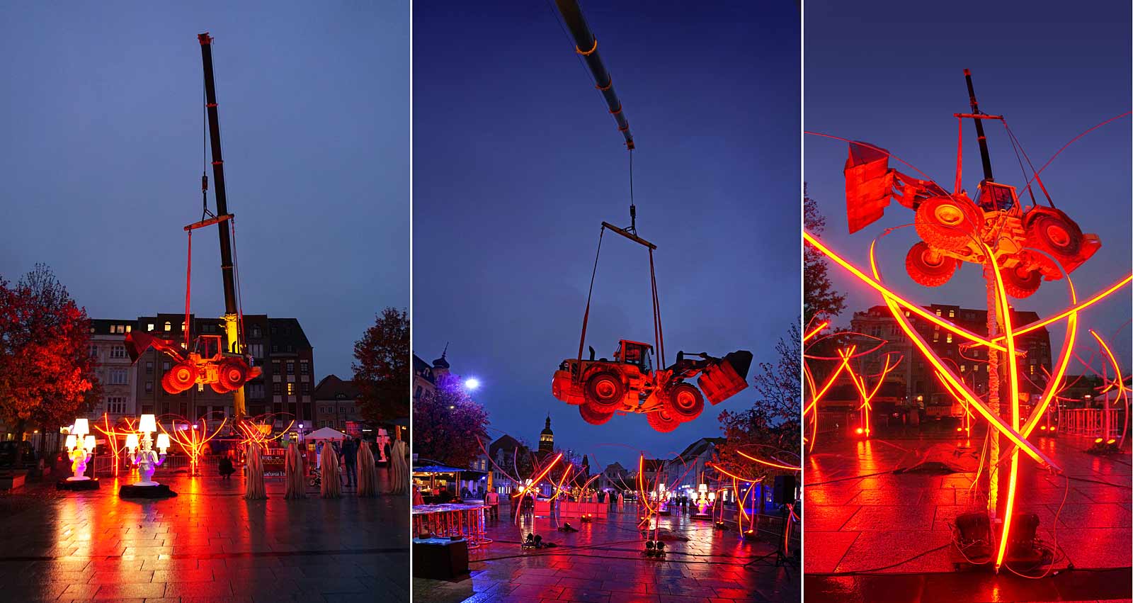 Am 30. Jahrestag der Fall der Mauer hatte Hanitsch eine eigene Interpretation zum Thema "Einer Trage des Anderen Last" vorgestellt. Damit war nicht die Story des gleichnamigen DEFA-Films gemeint, vielmehr sollte eine universellere Sicht für ein Miteinander ausgelotet werden und dieses auf verschiedene Ebenen. Biblische Themen werden genauso zitiert (das Martinsfest stand bevor) wie die Aufforderung doch mal selbst sein Ego für andere zurück zu schrauben. Allein bei der Umsetzung des Themas gab es bei den Betrchtern einige (gewollte?) Irritationen. Übergroße barocke Leuchter mit Mönchsfiguren ohne Inhalt, Lichtbäume und letztendich der Kran, der einen Radlader trägt kämpfen um die Gunst des sehenden Auges. Erkenntnis...blieb zumeist aus, angesichts der vielen widersprüchlichen Elemente, die dann auch noch mit Dance-Trance-Techno-Musik untermalt wurde. Einige Betrachter wünschten sich weniger plakativer Gigantismus, beispielsweise der 137 Tonnen schwere Kran - 62 Tonnen der Kran und 75 Tonnen der Ausgleichsballast für die Hebung des Radladers wirkte etwas erdrückend, überdimensioniert. Einzig die Witterung kam Haniitsch zur Hilfe und spiegelte das Licht auf dem Regen-nassen Platz. Dies lies dann doch ein wenig von dem durchblicken, was Jörn Hanitsch ausmacht - filigranes und überraschendes Lichtdeseign.