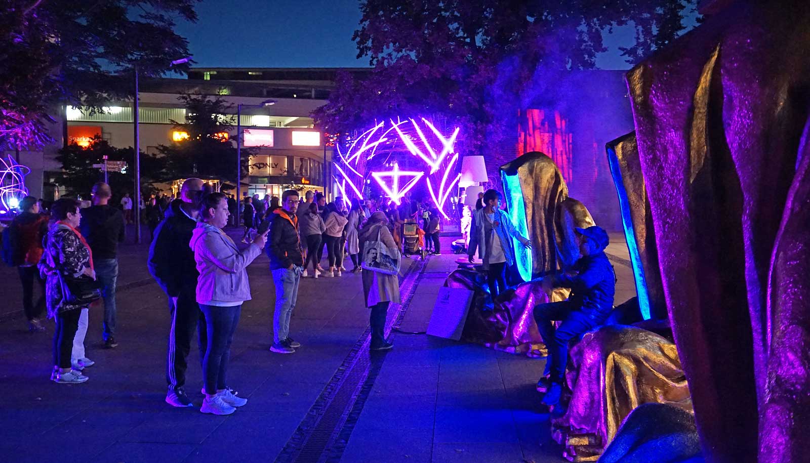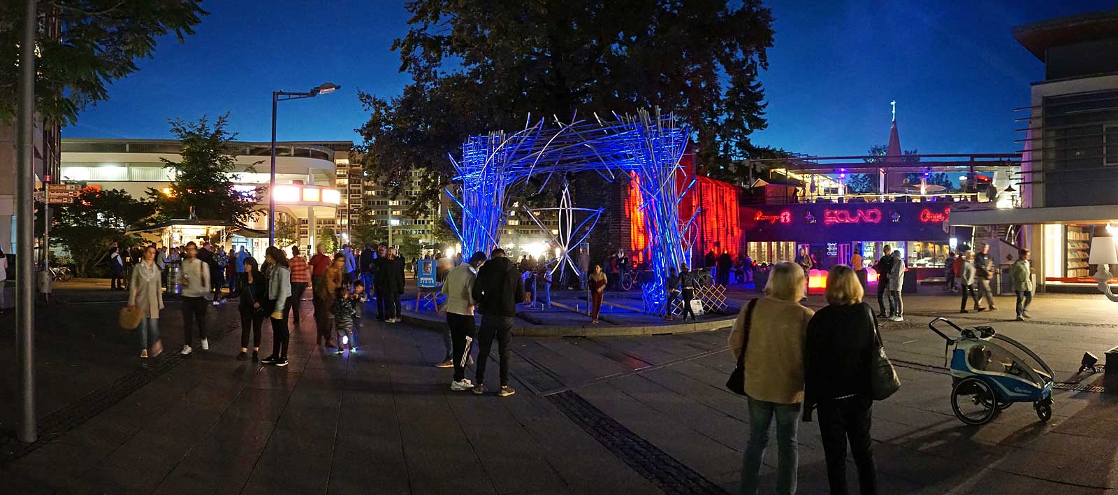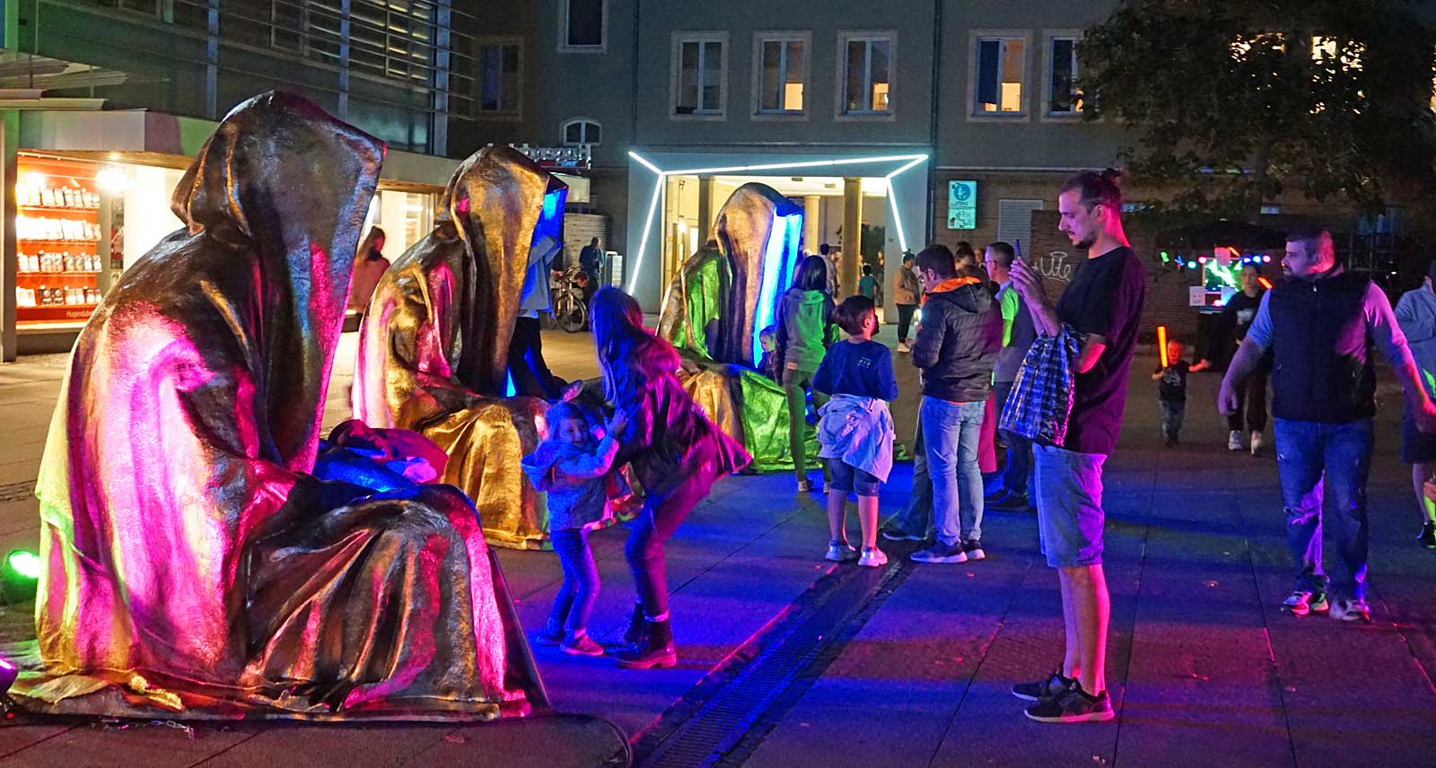 Ob vom Künstler so gewollt oder ungewollt: das war eine wichtige Veranstaltung zum richtigen Zeitpunkt und am richtigen Ort! Monate lang lähmte die Corona-Epidemie das gesellschaftliche Leben in der Stadt. Größere Veranstaltungen und viele kulturelle Ereignisse wurden abgesagt oder sehr beschränkt abgehalten. Das macht etwas mit den Menschen einer Stadt. Es fehlt der Ausgleich, die Lockerheit einer Gesellschaft, die sowieso schon viel zu hektisch und angespannt daher kommt. Mitten in der zweiten Corona-Welle - die Infektionszahlen in Deutschland stiegen wieder einmal - setzte Jörn Hanitzsch mit seinen Licht-Bildern ein ganz wichtiges Zeichen. Der Titel seines Licht-Events "Netzwerk des Lebens" passte punktgenau, zumal er alle Interpretations-Möglichkeiten zum Thema Corona offen ließ. Es störte nicht, das die inzwischen bekannten Glasfiber- und Plastik-Figuren des Österreichers Manfred Kielnhofer wieder mit dabei waren - jene Figuren, die von manchen Betrachtern in der Vergangenheit hin und wieder als Kitsch abgetan wurden (Was ist eigentlich Kitsch?). Doch wer sich die Zeit nahm und sich auf einer der vielen Sitzmöglichkeiten in der Stadpromenade setzte, der konnte beobachten, wie das Publikum gerade mit jenen Figuren interagierte. Köstlich, ob der Vielfalt solcher Szenen! Und.... mehr davon in solcher Zeit...