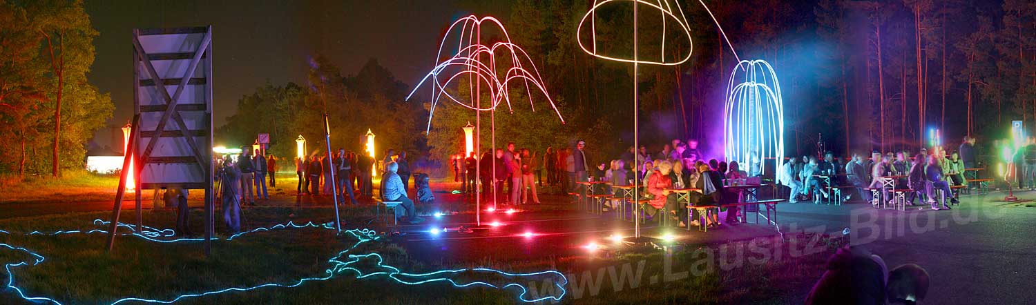 Das nachfolgende Panorama zeigt, wie sehr sich Harnitzsch`s Lichtgestaltung mit den zufälligen Gegebenheiten zu einem Bild ergänzt. Zu sehen war das für den Besucher aber erst, wenn dieser den Aussichtsturm erklomm. Dann sah man, wie sich der gestaltete Lichtraum des Künstlers gen Stadt zuwendet - sicherlich auch so gewollt. In der direkten Verlängerung nach Norden erschien, aus der Höhe betrachtet, die voll beleuchtete Förderbrücke des Tagebaus Cottbus-Nord und in noch weiterer Ferne das hell erleuchtete Kraftwerk Jänschwale. Die ganze Szenerie wirkte wie eine Zeitmaschine - im Norden das Alte, Vergängliche und im Süden der Aufbruch zu neuen Ufern - als Betrachter stand man zwischen beiden Zeiten - unfassbar symbolträchtig - ein prägender Eindruck.