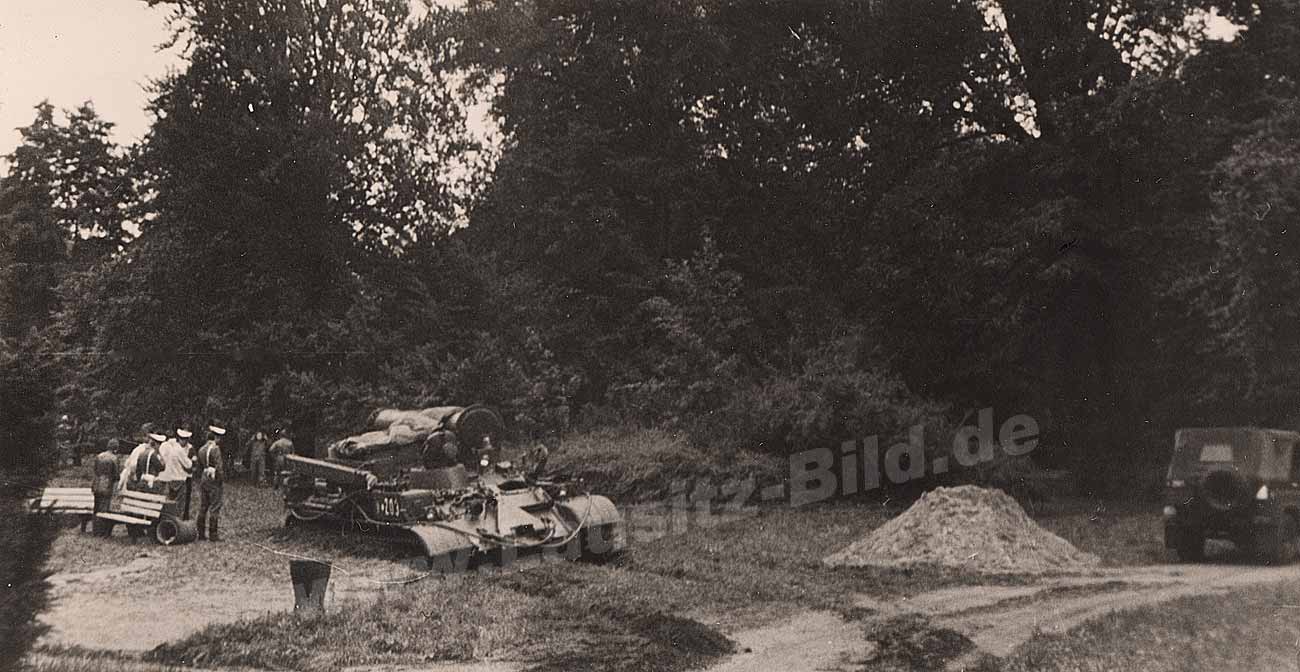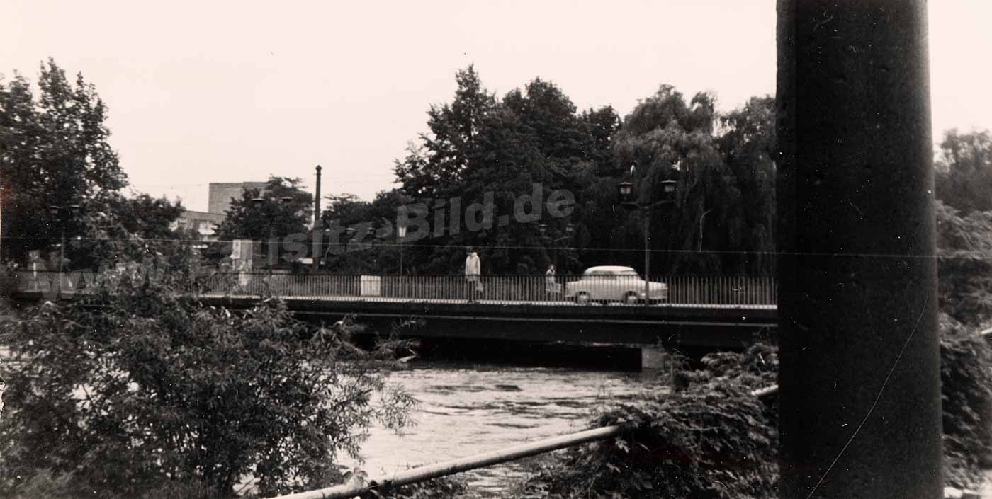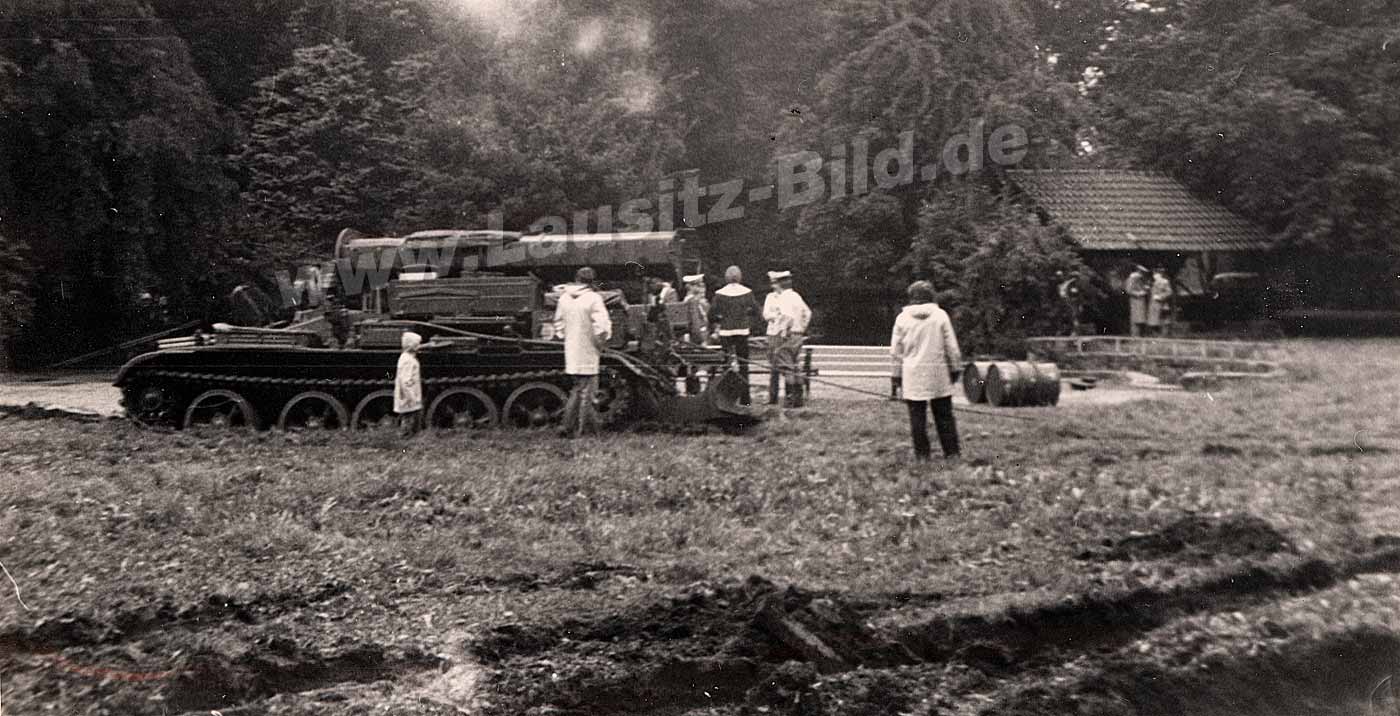 Die nachfolgenden beiden Bilder zeigen den ersten Versuch den Blechensteg zu sichern. Die Brücke war inzwischen in die Jahre gekommen und hatte schon mehrere Hochwasser überstehen müssen. Dazu ruhte der Steg auf sehr vielen Pfeilern, was den Wasserdruck in Fließrichtung erhöhte. Treibgut in der Spree erhöhte die Gefahr. Es musste gehandelt werden. So kam ein Bergepanzer der NVA zum Einsatz, der die Brücke mit Stahltrossen sichern sollte. Theoretisch, denn der Boden am Spreeufer war völlig aufgeweicht, an manchen Stellen wie Wackelpudding. Trat man auf eine vermeindlich begehbare Stelle, bildete sich sofort eine kleine Pfütze rund um den Fuß. Kein gutes Areal für einen tonnenschweren Panzer. Schon der Versuch an das Spreeufer zu gelangen, endete am Kinderspielplatz/Goethepark. Der Panzer grub sich ein und über Stunden ging nichts mehr. Zu erwähnen wäre noch, das die Aufnahmen versteckt gemacht wurden. Militärtechnik zu fotografieren war sowieso tabu, und das Versagen dieser Technik war auch nicht gern gesehen. So war ich ich mit einer minderwertigen Kamera unterwegs (20 Mark - Beirette SL 100), natürlch keine Qualitätsbilder machte, die aber leichter zu entbehren war. Hätte ich meine damalige Neuerwerbung, eine Spiegelreflex-Kamera (Praktika L) mit gehabt und mit Belichtungsmesser und Einstellung der Kamera zeitlich länger herumhantiert, dann wären sicherlich die Herren mit den weißen Koppeln (Militärpolizei) auf mich aufmerksam geworden. Im günstigsten Fall wäre ich dann meinen Film losgeworden, im schlimmsten Fall auch die Kamera-Ausrüstung, nachträgliche polizeiliche Nachforschungen inklusive.