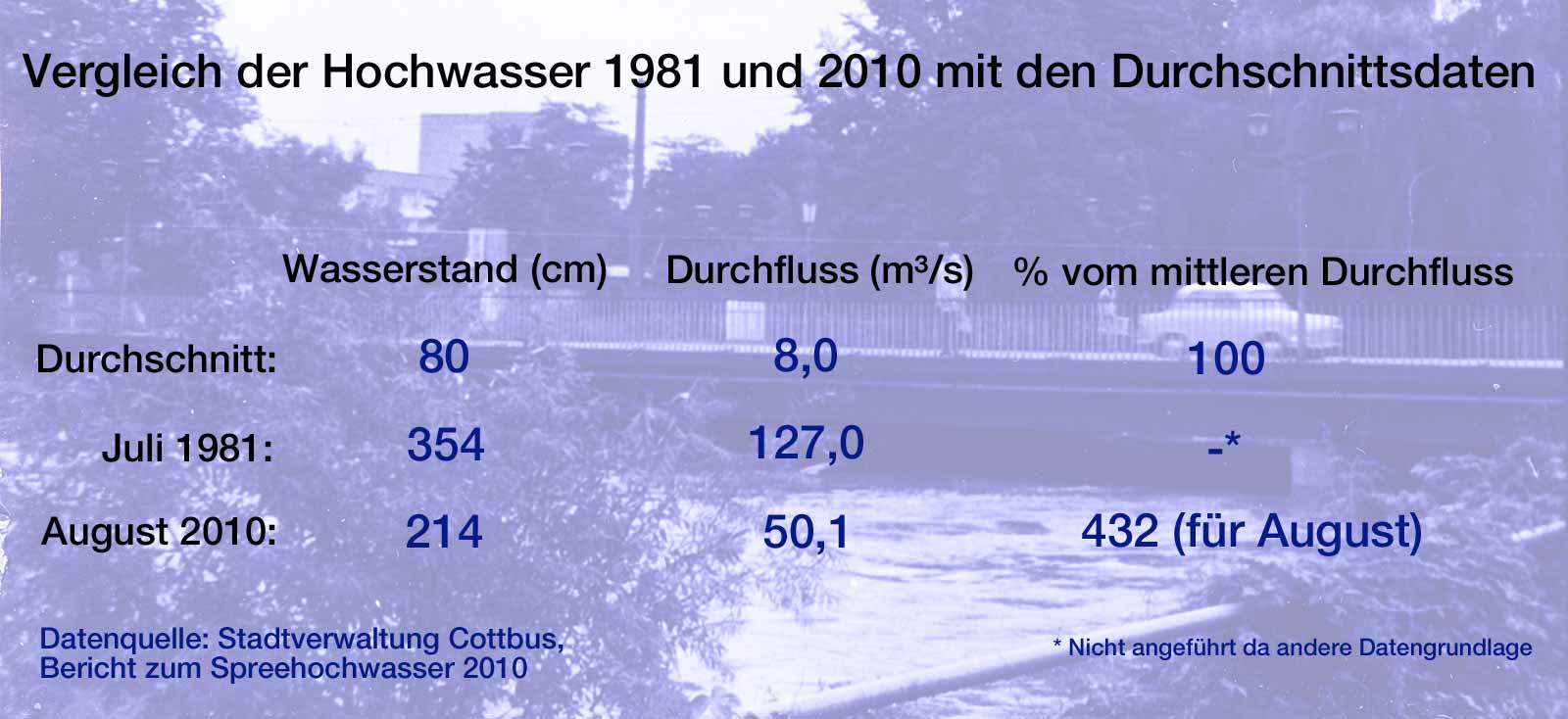 Hochwasser hat es in der Cottbuser Vergangenheit schon immer gegeben - früher wesentlich häufiger und verheerender als heute. Nach Aufzeichnungen des Kreisbauamtes Cottbus im Jahre 1933 wurde der Spreewald im Zeitraum von 1897 bis 1933 124-mal von Hochwasser heimgesucht.Der damalige Kreismeister Hermann Kais analysierte den "Vorgang Hochwasser" und kam bei seinen Beobachtungen bis 1933 zu dem Ergebnis: "In 15 Jahren 25 kleine Hochwasser, in zwölf 17 mittlere Sommerhochwasser, in drei Jahren vier große Sommerhochwasser, in 24 Jahren 31 kleine Winterhochwasser, in 26 Jahren 41 mittlere Winterhochwasser und in sechs Jahren sechs große Winterhochwasser.