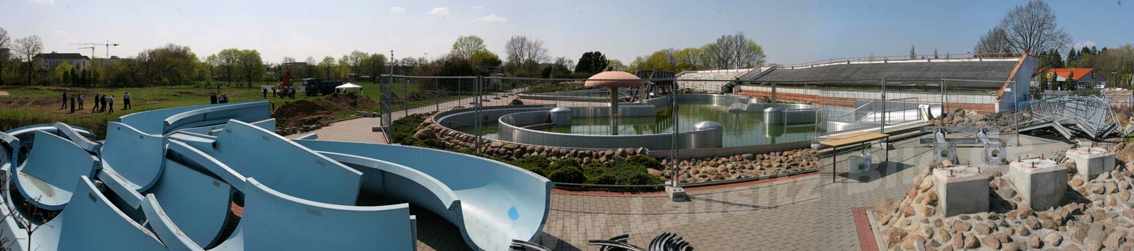 Die nachfolgenden 3 Panoramen zeigen den Zustand von 1999. Das Schwimmbecken und das Sprungbecken waren schon verschwunden und sind durch zwei "Spaßbecken" ersetzt worden. Im Jahre 1993 entstand nahe des Eingangsbereichs eine Wasserrutsche, die schon 2006 beim Neubau der Lagune wieder abgerissen wurde. Die Eintrittspreise im "Jahn" waren sehr moderat und in jedem Fall nie Kosten-deckend. In den 60er Jahren musste man 20 bzw 50 DDR-Pfennige für den Badespaß zahlen, in den 80ern waren es um die 1 bzw. 2 DDR-Mark. 1989, zur Wende, sah man allerdings schon reichlich Verschleißerscheinungen auf der Anlage - Beton und Boden Kacheln bröckelten, die Becken zum Teil undicht und die Umkleidekabinen eher unappetitlich. Trotzdem in den folgenden Jahren immer wieder partiell am Bad gewerkelt wurde, blieb der altbackende Charme erhalten. Zudem hatten sich das Bade-Verhalten mit der Wende geändert. Mehr Spaßbad als Wettkampfbad war angesagt, Attraktionen mussten her.
