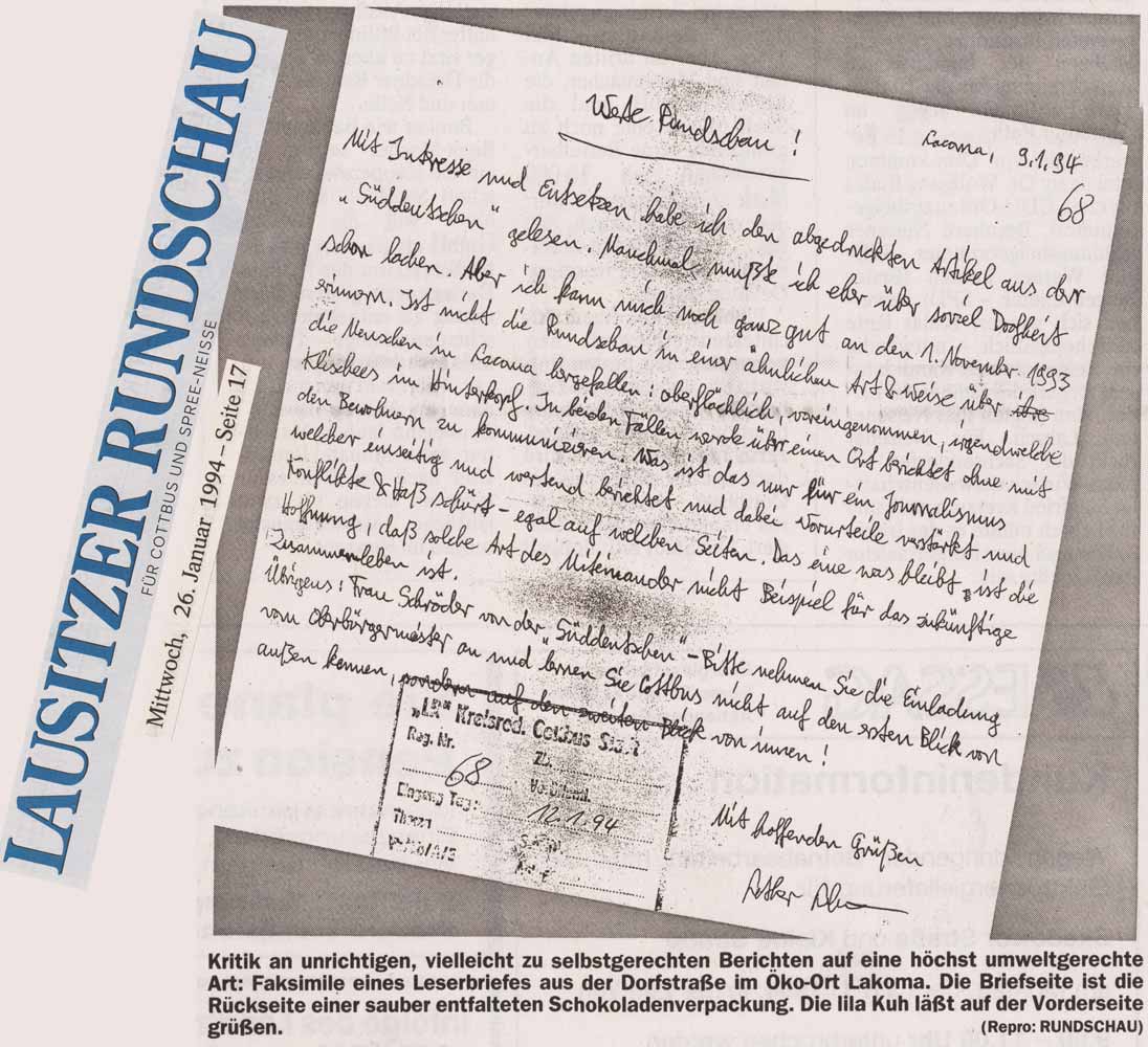 Vor 1989 war das Thema so gut wie tabu. Die Notwendigkeit der Kohleindustrie wurde aus Mangel anderer Energieträger nicht in Frage gestellt. Zudem hatten weit mehr Menschen als es heute (2020) der Fall ist, ein gutes Auskommen und ihre Arbeit wurde hoch geachtet. Der Bezirk Cottbus wurde ob seiner Schlüsselstellung in der Wirtschaft besser als ananderen Orten versorgt und die Menschen waren mehrheitlich zufrieden. Luftwerte, Schadstoffe im Wasser, Beeinträchtigungen durch die Tagebaue und Vernachlässigung des Naturschutzes schienen bei den Meisten tolerierbar. Das ist übrigens auch ein Grund, warum die friedliche Revolution 1989 hier später losging, als in anderen Bezirken der Republik. Nur wenige Bürger erkannten die wachsende Gefahr und relativ Wenige wurden durch die Umsiedlugen wegen der Tagebaue direkt betroffen. Das änderte sich langsam, als 1989 Energie-Alternativen zur Verfügung standen und gleichzeitig Beschäftigte in Größenordnungen im Energiesektor ihre Arbeit verloren. Zeitungen, Fernsehsender, das noch junge Inetrnet und Radio erlebten in den Nachwendejahren eine Renaissance, die aber sehr schnell den Gestzen des "Marktes" unterworfen wurden. Vor allem Zeitungen schrumpften in den Auflagen und waren nur überlebensfähig, wenn genügend Inserate vor allem an die Großindustrie verkauft wurden (und/oder wen die Flucht ins Internet gelang). Das Dilemma: die Lausitz befand sich mitten in der Deindustrialisierung. Es gab immer weniger Werbekunden und von den Wenigen die es gab, machte sich vor allem die größte regionale Zeitung mehr oder weniger abhängig. Im Falle der Niederlausitzer Region ging die Beinflussung sogar so weit, das es kaum eine größere Sportveranstaltung, dieverse Kulturhöhepunkte oder (genehme) Initiativen gab, die nicht von LAUBAG, Vattenfall oder (später) Leag gesponsert wurden. Die Region war fest im Griff der Energie-Riesen und jeder hütete sich, genauer nach zu fragen und auf das Sponsoring zu verzichten. In Zeitungen las man überwiegend Artikel die pro Vatenfall waren. Natürlich waren auch unverfängliche Artikel über das eine oder andere Fest in Lakoma zu finden, aber Grundsatz-Diskussionen für Alternativen jenseits der Braunkohle waren weitestgehend tabu. Inmitten diesem Spannungsfeldes meldete sich auf ungewühnliche Weise eine Frau aus Lakoma an die Zeitung. Es ging da ursprünglich über ein Zerrbild-Bericht der Südeutschen Zeitung über Cottbus, hatte aber auch die Berichterstattung über Lakoma im Blick: