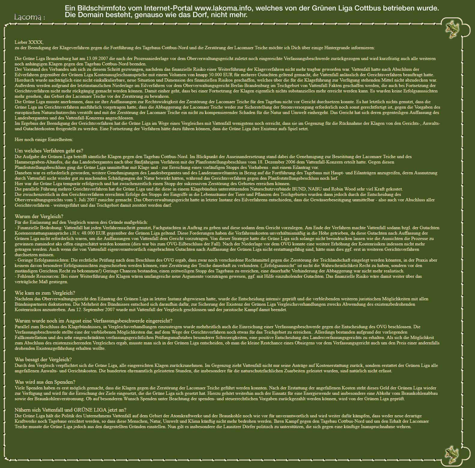Durch das Landesamt für Bergbau, Geologie und Rohstoffe erging der Beschluss zur Beseitigung der Lacomaer Teiche für den Braunkohletagebau. Dagegen klagte die GRÜNE LIGA und wurde dabei von ROBIN WOOD, NABU, BUND und den Naturfreunden Brandenburg unterstützt.