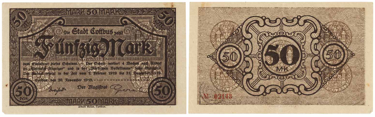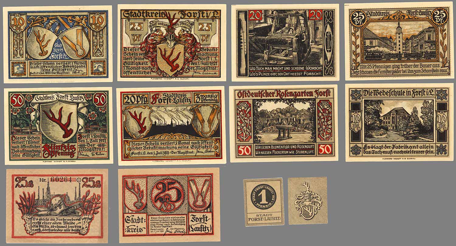 Während die Notgeldausgaben in Cottbus sehr nüchtern ausfiehlen, nutzten andere Städte die kleinen Scheine um Stadt- und Witschaftswerbung zu betreiben. Ein Beispiel dafür ist Forst/Lausitz mit seiner Textilindustrie und dem Rosengarten. Adere Städte legten regelrechte Serien auf und stellten regionale Trachten oder sehnswerte Architektur vor. Wer es sich leisten konnte sammelte die bunten Geldersatz-Scheine. Deshalb sind noch heute unzählig druckfrische Scheine zu haben.
