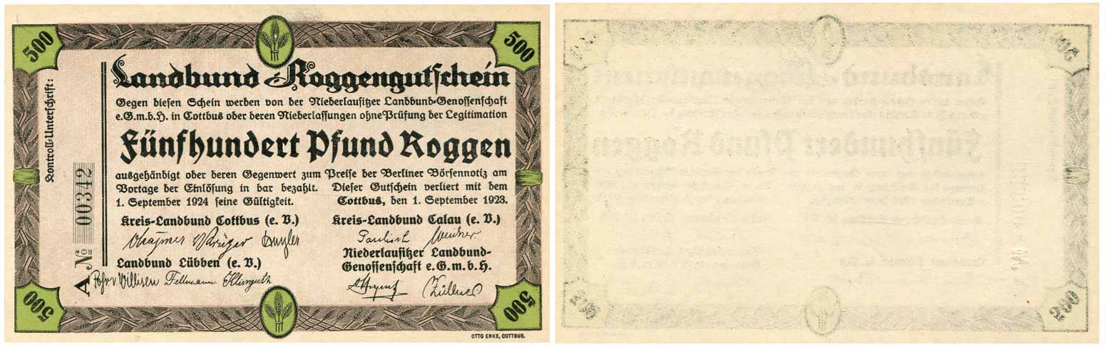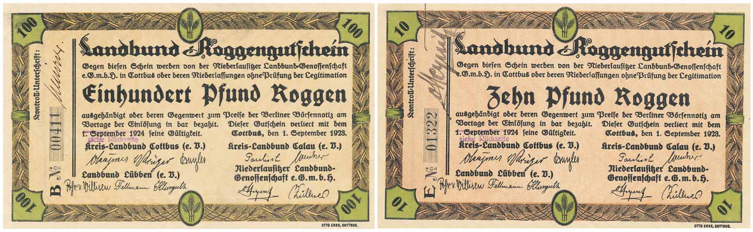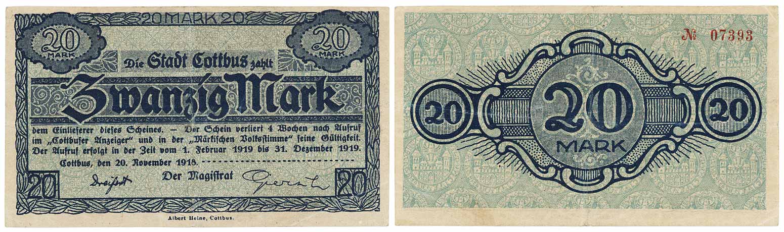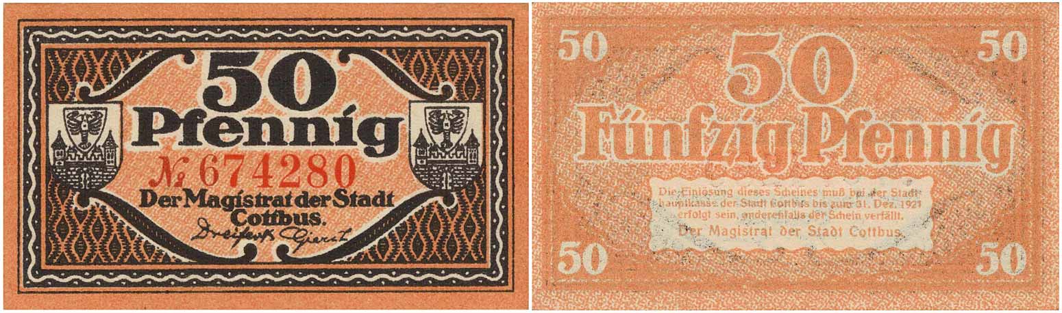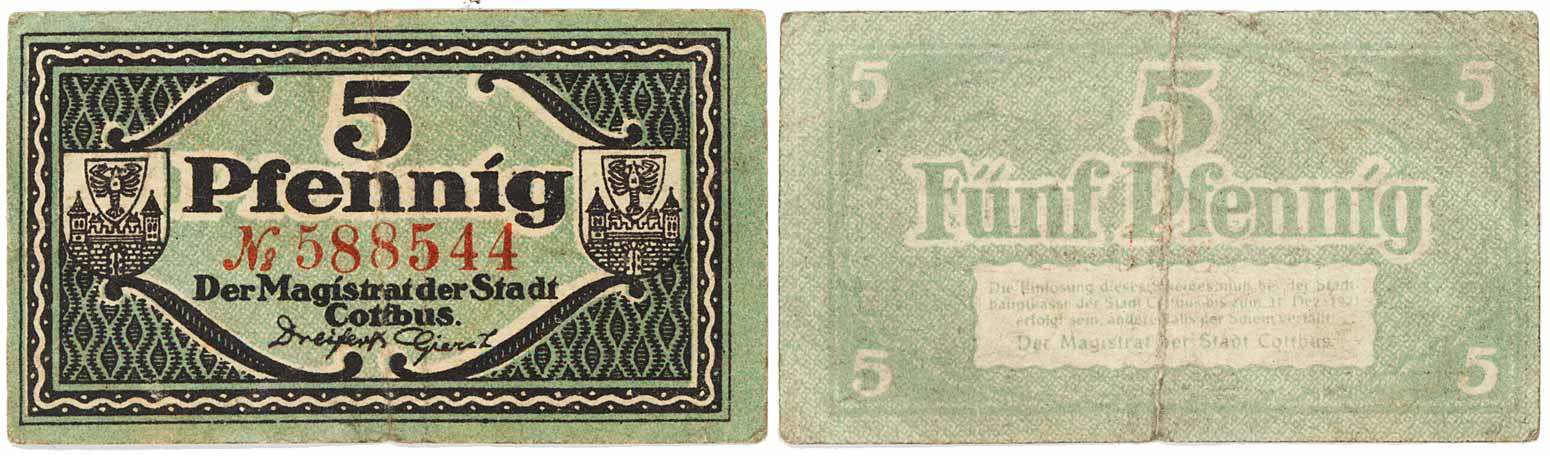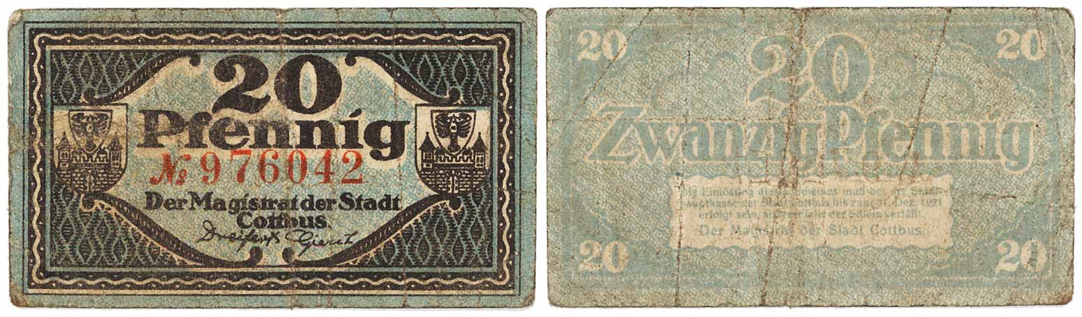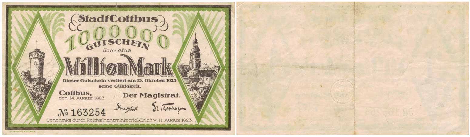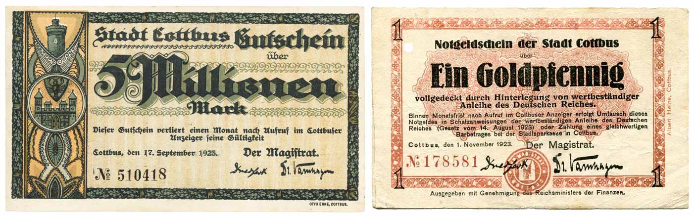 Die Geldentwertung nahm geradezu unvorstellbare Ausmaße an. Am 21. Mai 1925 stand der Kurs bei 8,40 Goldmark gleich Hunderttausend Papiermark. Schon ab 11. August näherten sich die Preise für Grundnahrungsmittel von Tag zu Tag rascher der Millionengrenze. Es herrschte akuter Geldmangel. Das Papiergeld wurde knapp. Deshalb sah sich der Magistrat der Stadt Cottbus veranlaßt, im August 1925 Groß-Notgeld herauszugeben. Es wurden 100.000-, 500.000- und 1.000.000-Mark-Scheine im Gesamtwert von 100 Milliarden Mark gedruckt und in Umlauf gesetzt. Die Scheine besaßen als Zahlungsmittel ihre Gültigkeit bis zum 15. Oktober 1923." Die Originalgröße der Cottbuser Notgeldscheine betrug ca. 14,5 mal 8,2 Zentimeter. Sie waren vom Oberbürgermeister Hugo Dreifert und dem Bürgermeister Dr. Adolf Varnhagen unterzeichnet. Alle Notgeldausgaben von 1917 bis November 1923 wurden bei den Cottbuser Firmen Enke und Heine gedruckt. Etwa 140 verschiedene Ausgaben kamen in Umlauf. Um dem, in der Stadt herrschenden Kleingelclmangel zu begegnen, ließ die Stadt im März 1921 achteckige eiserne Fünf- und Zehn-Pfennigstücke in den Zahlungsverkehr geben. Gegen Ende des Jahres zog man diese Münzen wieder ein. Infolge der steigenden Teuerungen hatten sie ihre Funktion als Scheidemünzen verloren.