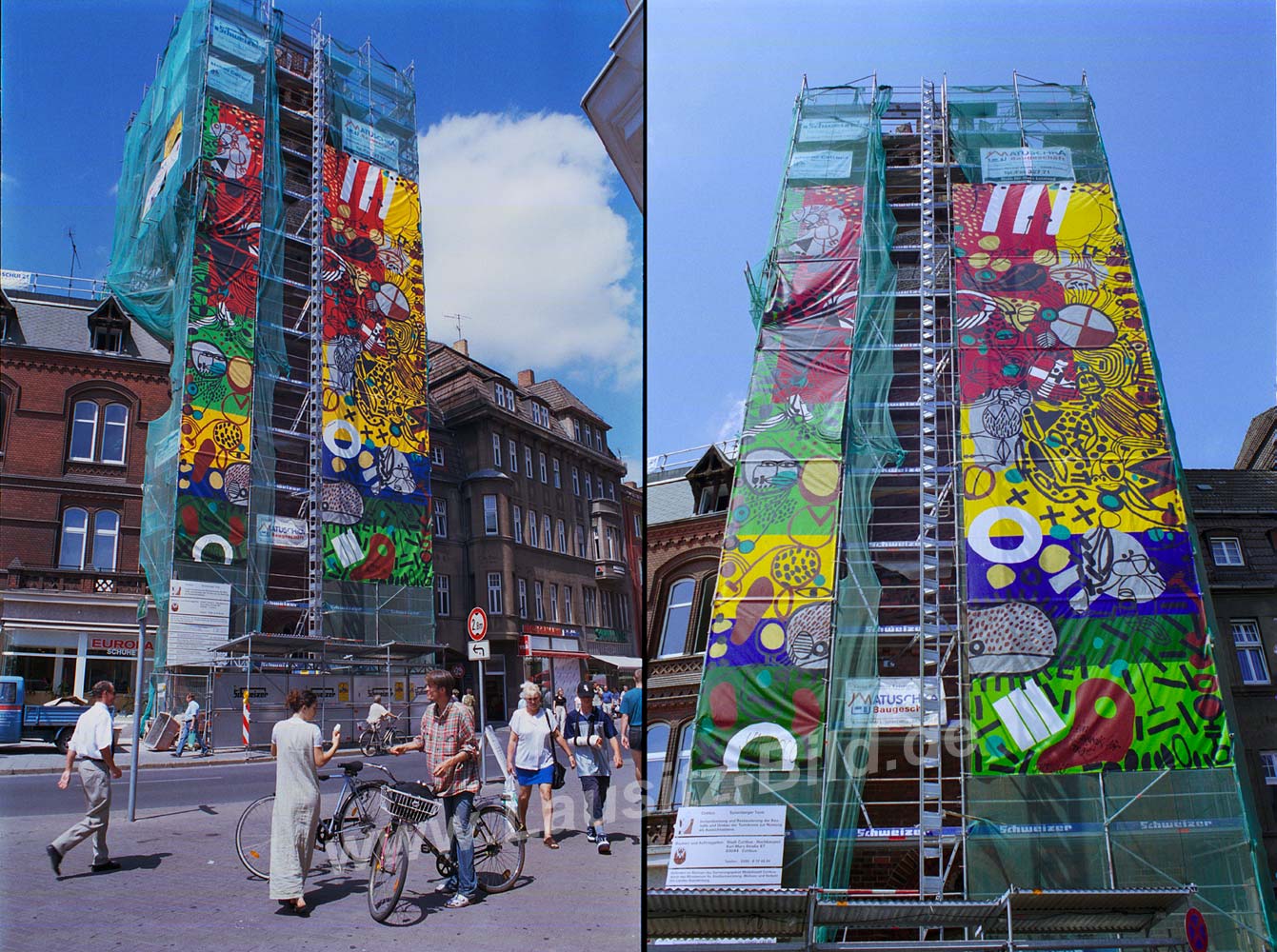Das zweite Event war an die Aktion "ein Glockengestühl für den Spremberger Turm" anknüpfend. Hans Scheuerecker, stadbekannter universeller Künstler, Lebemann und Stifter, nutzte die Bühne Brandenburger Platz, um öffentlich ein, im wahrsten Sinne des Wortes, ganz großes Werk zu erschaffen. Scheuerecker hatte vor, das Baugerüst am Spremberger Turm auf der Sichtseite mit einer großen und gestalteten Plane zu versehen.
