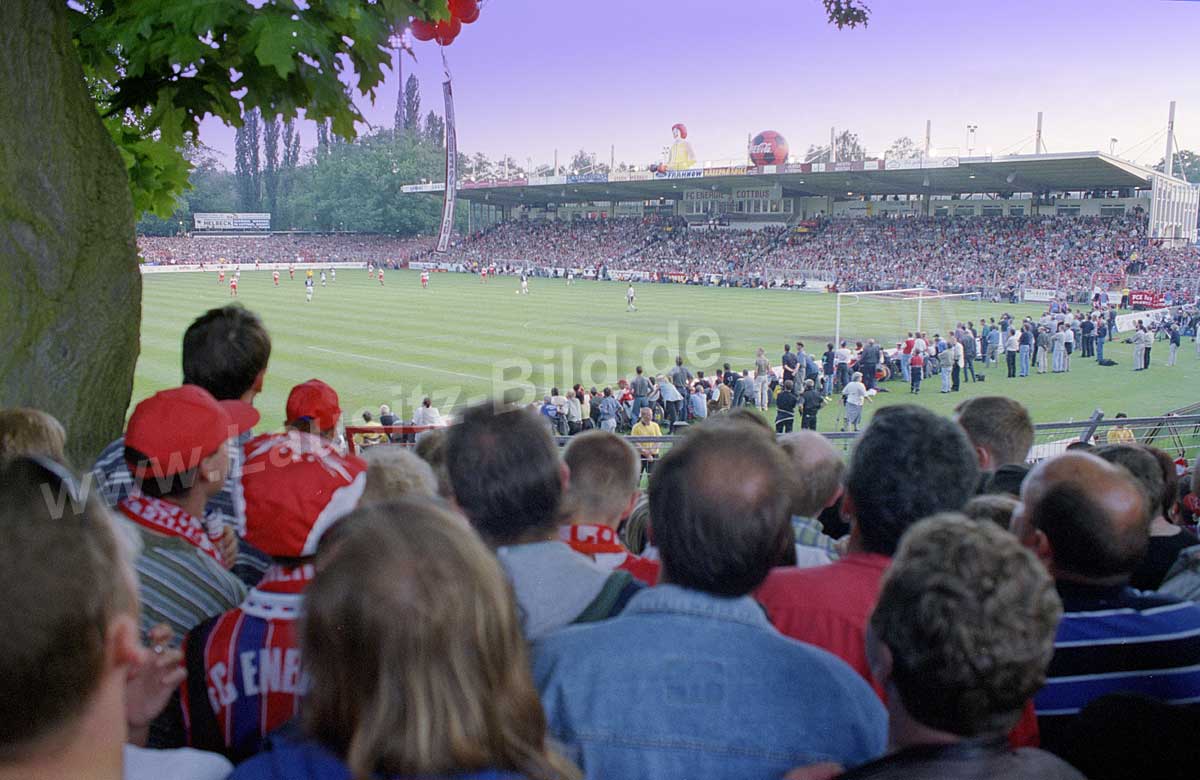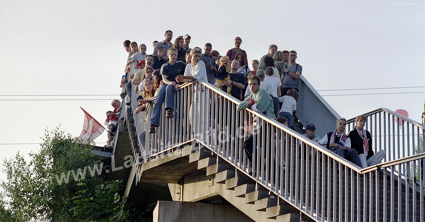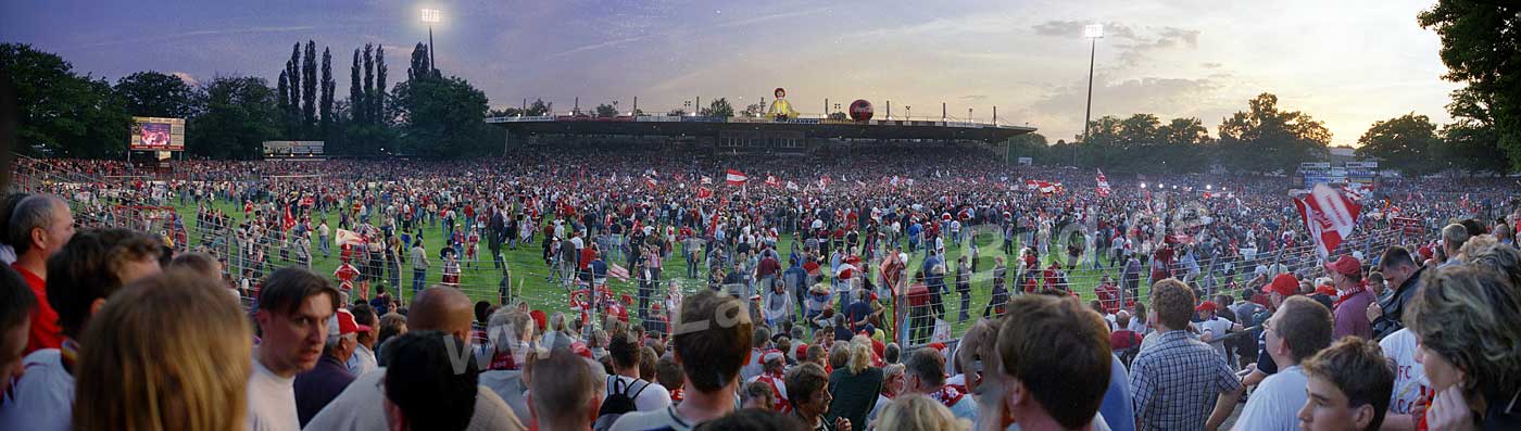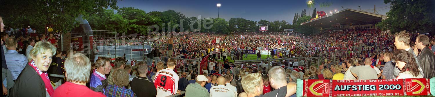 Letztendlich muss ich noch dem dritten Event an diesem Tage ein paar Zeilen widmen, zumal gerade diese Sportveranstaltung eine Menge für das Cottbuser Selbstwertgefühl machte. Der FCE lag vor dem alles entscheidenden Spiel auf Platz 3 der 2. Bundesliga, vor ihm (schon aufgestiegen) der 1. FC Köln und VfL Bochum. Dahinter die Mitbewerber um den Aufstieg: Borussia Mönchengladbach und 1. FC Nürnberg. Gespielt wurde gegen den Tabellenführer und das Wunder geschah: Energie gewann mit 2:0 gegen Köln und war in der 1. Bundesliga. Was nach Schlusspfiff auf dem Platz geschah, lässt sich nur schwer mit wenigen Worten beschreiben. Da lagen sich Männer, groß wie Schrankwände, in den Armen und heulten wie kleine Kinder. Man sah Fans die mit abwesend irren Gesicht die Tore demontierten und es gab viele, die ein Stück des Stadionrasens vor sich hertrugen, als wäre es ein faustgroßes Gold-Nugget. Alle waren gelöst, lagen sich in den Armen und blickten außer sich vor Freude in die Kamera. Es war der krönende Abschluss an einem Tag, der mich so viel Emotionen sehen ließ wie kaum ein anderer und so bleibt mir dieser 26.Mai 2000 für immer als der Tag in Erinnerung, an den ich die meisten Cottbuser mit Freude im Gesicht sah.