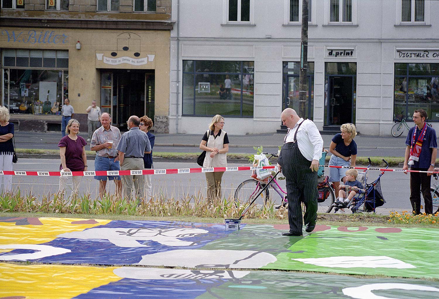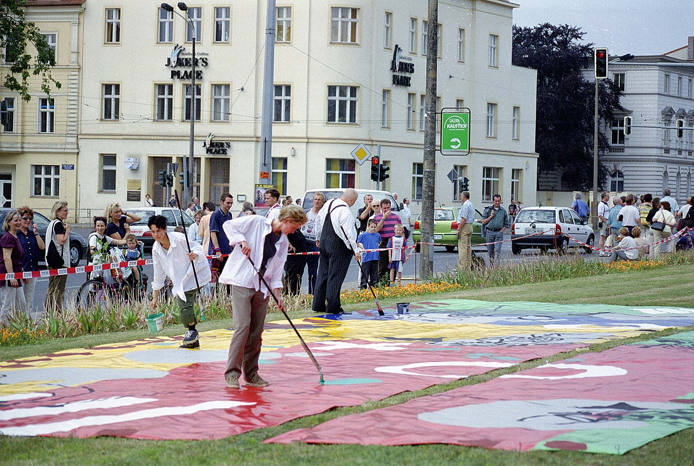Ich weiß nicht wie Hans Scheuerecker sein Event geplant hat, was er damit erreichen wollte. Aber im Umfeld der Aktion passierte etwas. Während der Meister ruhig und bedächtig den einen und anderen Strich auf die beiden insgesamt 130 Qudratmter großen Planen setzte, wirbelten seine drei Assistentinnen eifrig unter seiner Regie herum. Unterdessen füllte sich der Brandenburger Platz unmerklich mit Zaungästen und genau diese erweckten mein Interesse. Die Leute schauten auf das Schaffen, teils sichtlich verwirrt, teils ungläubig aber auch angestrengt, um irgendeine Deutung des entstehenden Bildes zu erlangen. Die Blicke der Zuschauer gingen immer häufiger zum (wildfremden) Nachbarn (Hatte der was verstanden?) und dann lächelte man sich gemeinsam an. Köstlich. Ich habe noch nie auf dem Brandenburger Platz so viele Cottbuser sich anlächeln sehen. Zumal deren Zahl immer größer wurde und das hing wiederum mit dem dritten Event zusammen, welches Cottbus an diesen Tag erleben durfte. Es war DER Tag an dem der FC Energie Cottbus das entscheidende Spiel für den Aufstieg in die 1. Bundesliga absolvierte. Dazu war der Stadtring komplett gesperrt worden, so das alle Fans auf dem Weg ins Stadion am Brandenburger Platz vorbei mussten, vorbei an Scheuereckers Kunst. So kam es zu den herrlichen Bildern, das sich ein aufgeladener Energie-Fan an seinen Plastebecher mit Bier festhielt (wir erinnern uns an den oben erwähnten mobilen Getränkestand) und auf der anderen Seite der Künstler, hin und wieder an einem Gläschen Wein nippend, gelassena agierte - eine sicherlich klischeehafte, aber herrliche Situation. Zudem dürfte Hans Scheuerecker der Künstler in Cottbus sein, der die meisten Zuschauer bei einer Performance wie dieser hatte: fast ein ganzes Stadion voll. Egal wie man zu der Kunst Scheuereckers steht, mir blieben die vielen lächelnen Gesichter auf dem Brandenburger Platz in Erinnerung - Kunst macht eben doch etwas mit den Menschen...