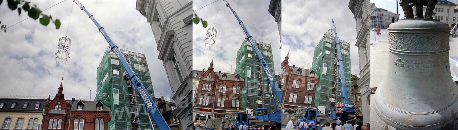 Zwischenzeitlich wurden der Glockenstuhl und gegen 15:00 Uhr die beiden, 1906 in Apolda gegossenen Bronze-Glocken auf das Dach des "Dicken" gehoben, wie die nachfolgenden Bilder zeigen.