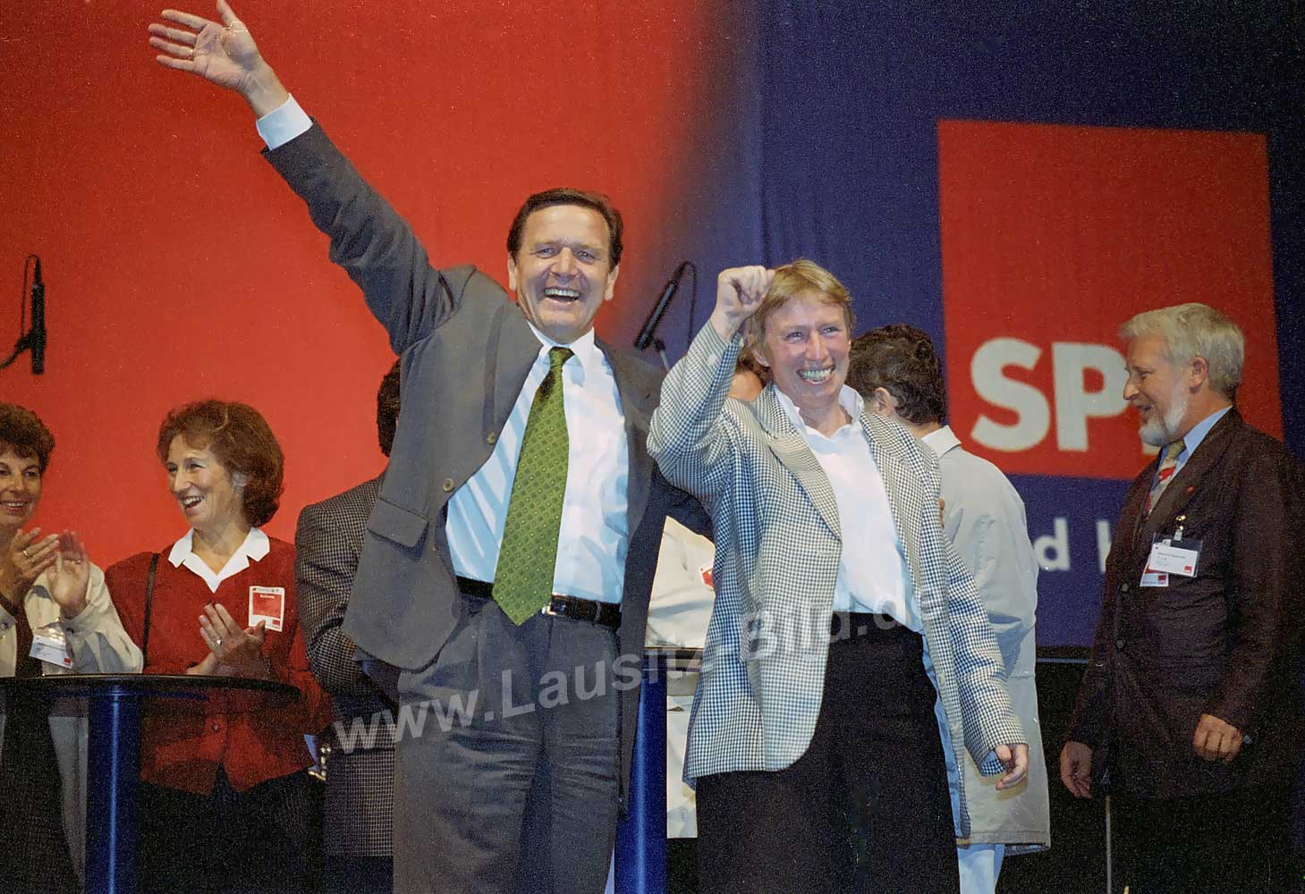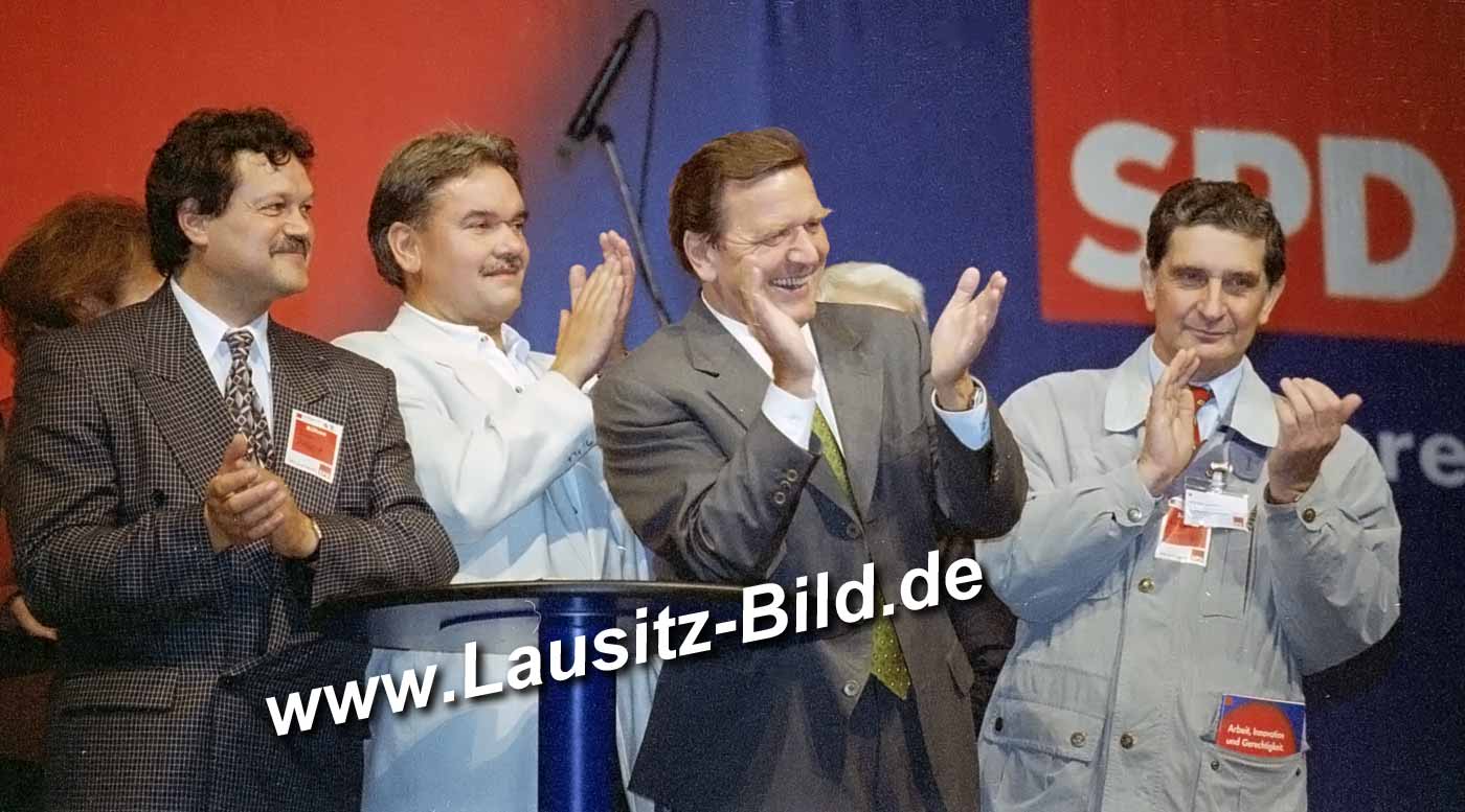 Zu Beginn der heißen Phase des Bundestagswahlkampfes, im Mai 1998, hatte Gerhard Schröder einen Termin in Cottbus. Das Interesse war groß. Schon im Vorfeld der Veranstaltung war der Cottbuser Altmarkt gut gefüllt. Mit Beginn der Schröder-Show fand sich dann kaum eine Lücke unter den vielen Besuchern. Die Show war perfekt ausgeklügelt und war mit einem hohen Aufwand verbunden. Zunächst begann eine Band die Bsucher "aufzuheizen" und es war nicht irgendeine Band, sondern die Rockgruppe, die bei den Ostdeutschen für Aufbruch und den Weg in die Freiheit steht: die Berliner Band "City". Die Rechnung der Wahlkampfstrategen ging auf. Die Cottbuser sangen textsicher mit und schaukelten sich zu einer begeisternden Euphorie auf. Die zweite Stufe wurde gezündet. Der Hoffnungsträger betritt den Altmarkt - nicht über einen geschützen VIP-Weg. Schröder nahm den Weg durch die Mnege, ehe er die Bühne betrat. Das machte Eindruck und die Cottbuser tobten - im positiven Sinne.