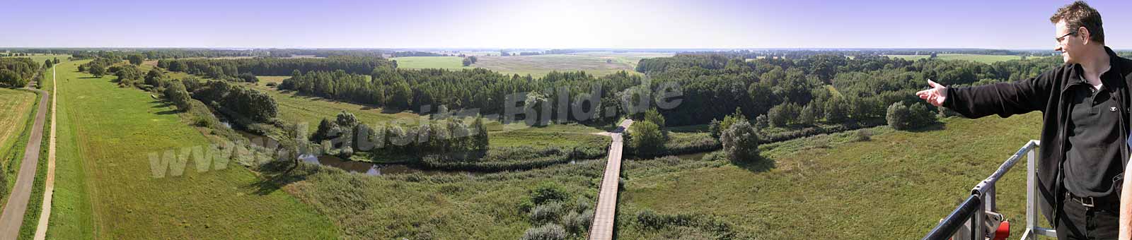Bild oben: Das Panorama p8125_2013 zeigt die Spree 1km nördlich von Döbbrick bei dem Hochwasser 2013. An dieser Stelle ist der Hauptarm der Spree normalerweise rund 10m breit. Auf diesem Bild reicht das Wasser aber von Deich zu Deich (ca 120m breit).Der Fotograf stand hier mitten im Wasser, um die ungewöhnliche Situation zu fixieren (Bitte nicht nachmachen!). 2007 wurde hier ein neuer Nebenarm angelegt (jetzt Land unter), der zu mehr Feuchtigkeit auf dem Areal führte. Trockenbäume wie Birke oder Pappel starben in der Folge ab und begünstigten Auen-typische Gewächse. So unterstützte die Natur selber die Renaturiengsmaßnahmen des Zweibeiners. Die rote Farbe der Spree zeigt das mitgefürte Eisenoxid aus den Tagebaurestlöchern im Süden an. Zwar gab es schon Rückhalteeinrichtungen und Strategien zur Ausfilterung des Eisens, diese waren in der Ausnahmesituation Hochwasser in ihrer Funktion eingeschränkt bis wirkungslos.
