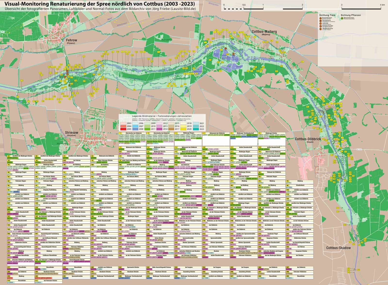 Hätte ich gewusst, welchen Umfang dieses Projekt annimmt, hätte ich entmutigt das Unterfangen fallen gelassen. Das bischen veränderte Grün abzubilden ist schnell erledigt - dachte ich. Weit gefehlt: über 1000 Panoramen (70% davon 360°-Panoramen) über 500 Luftaufnahmen und etwa genau so viel Einzelfotos zählte ich im Herbs 2021 zusammen. Alle Bilder wurden aufwändig beschrieben und georeferenziert (was für eine Strafarbeit!), Alles wurde so archiviert, das eine gesuchte Aufnahme sowohl digital als auch analog schnell gefunden werden kann. Dazu wurden neben der IPTC-Daten-Beschreibung eine Vectorkarte gezeichnet in der separat und geordnet nach Jahren alle Bilder eingetragen wurden. Diese Karte war die Grundlage, alle logistischen Arbeiten zum Visual-Monitorin nördliche Spreeaue zu planen und zu archivieren.