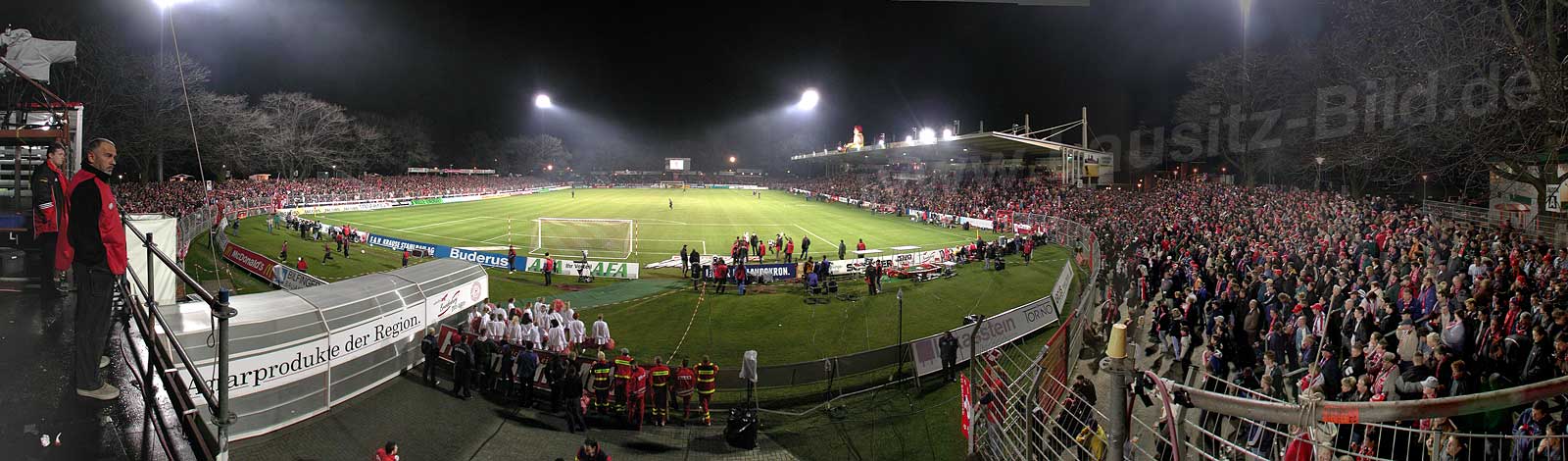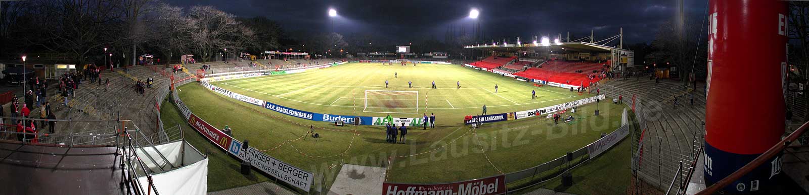 Panorama oben: Das waren magische Momente, wenn in Spätherbst die Sonne unterging und die Ostseite in rotes Licht tauchte. Die dicht am Stadion stehenden uralten Eichen glühten auf wie ein Signal: Rot-Weiße, gebt noch einmal alles...!