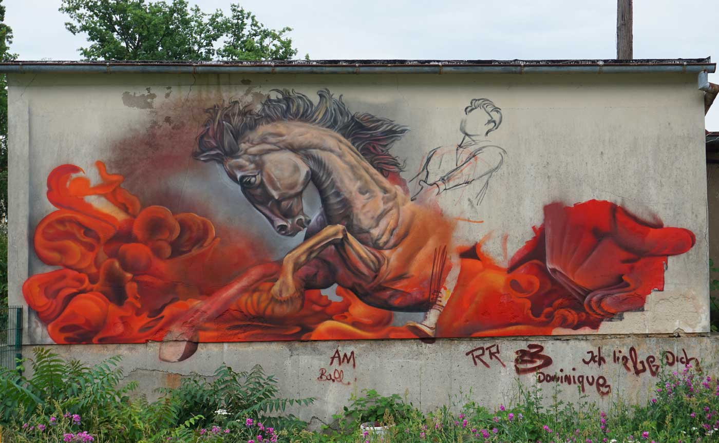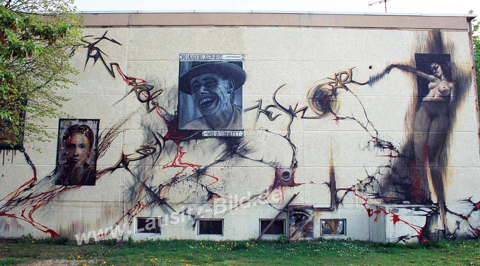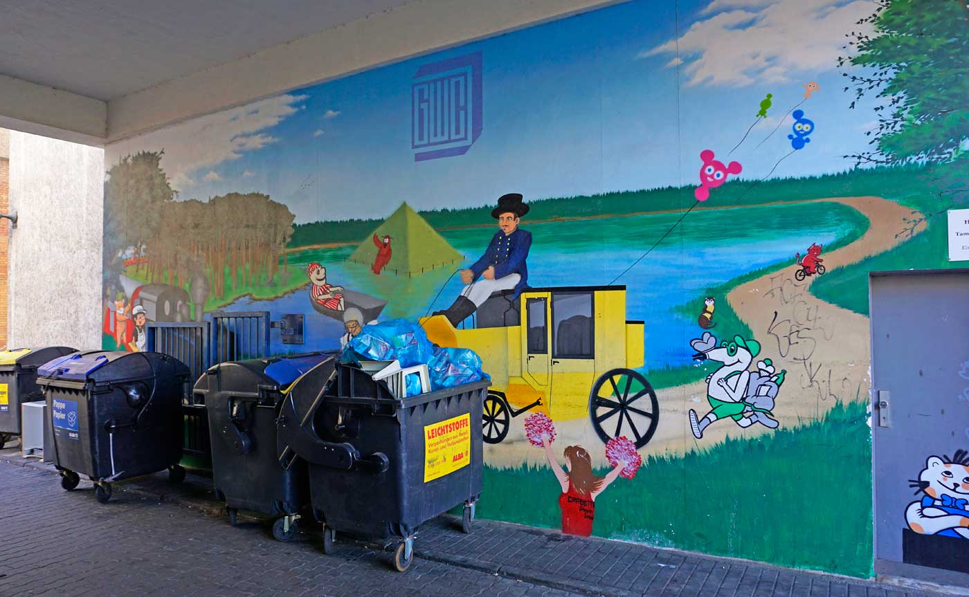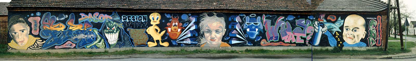 Sie ist einfach da, manchmal unbemerkt, oft temporär, machmal außergewöhlich und hin und wieder nah am Kitsch: Kunst im öffentlichen Raum. Sie ist ein Spiegel einer jeden gelebten Epoche der Gesellschaft und damit wertvoll und erhaltenswert. Grund genug, um ins Archiv zu gehen und diese Zusammenstellung zu zeigen. Es handelt sich hier nicht um eine vollständige und geordnete Auswahl an Wandbildern - vielmehr soll hier die Vielfalt der kreativen Arbeiten gezeigt werden - unabhängig vom Wert und der Einordnung für die Kulturgeschichte. Nicht bei allen Arbeiten konnten Urheber ermittelt und zusätzliche Informationen eingeholt werden. Sollte jemand sich und seine Arbeiten wiedererkennen, bin ich sehr dankbar, wenn sich dieser bei mir meldet. Die Kontaktdaten stehen im Impressum dieser Website.