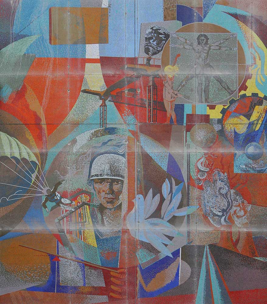 Bild-Nr. e0203235: Wandbild "Bauarbeiter" von Walter Heinrich (* 03.11.1927, Magdeburg; † 14.10.2008, Merzdorf bei Cottbus) aus dem Jahre 1977. Das 6,75 x 4,50 Meter große Werk wurde mit Emaillefarben auf Metallplatten hergestellt und zeigt die Verbundenheit der jungen Studierenden mit dem wertätigen Volk. Offensichtlich wurde diese Beziehung bis hin zur Farbgebung symbolisiert: das FDJ-Blau (Freihe Deutsche Jugend - die Jugendorganisation der DDR deren Mitglieder blaue Hemden trugen) und das Rot der Arbeiterklasse sollte die Aussage wohl unterstützen. Standort des Bildes: BTU Cottbus-Senftenberg, Lehrgebäude 1A, Hörsaal 1+2.