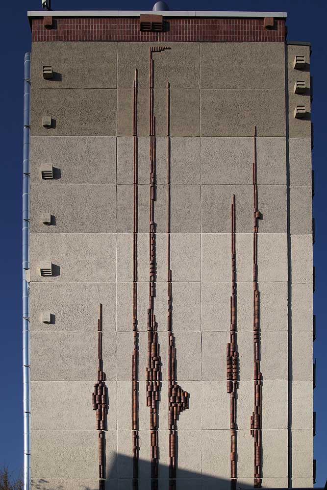 Betonrelief "Geschichte der Arbeiterbewegung" von Rudolf Sitte (* 13. Mai 1922 in Kratzau, Tschechoslowakei; † 4. März 2009 in Königsbrück, jüngerer Bruder des Malers Willi Sitte) am "Punkthochhaus" Berliner Platz 1. Umgesetzt wurde das Werk 1968/69 von den Mitgliedern der künstlerischen Produktionsgenossenschaft "Kunst am Bau" / Maße: 22 x 3,3 Meter / Material: Beton