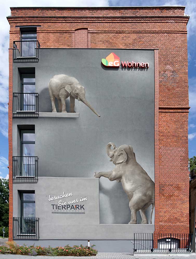 Bild-Nr. e0223854: "Besuchen Sie den Tierpark" Wandbild der Cottbuser Künstlergemeinschaft "Strauss & Hillegaart" am Gebäude Franz-Mehring-Straße 18, einem Wohnhaus der Genossenschaft "eG Wohnen" / Übergabe am 27.06.2014 / Größe: 8 x 12 Meter / Die Initiative für diese gelungene "Kunst am Bau" ging vom Tierpark-Förderverein und dem Wohnungsunternehmen aus. Zwei Wochen Arbeit stecken in diesem Projekt.