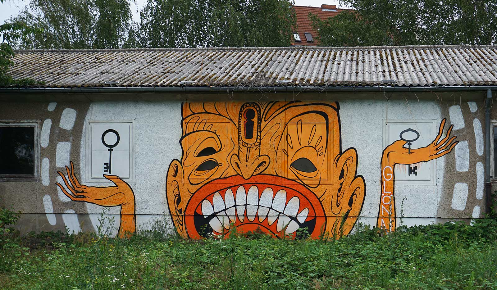 Temporäres Wandbild (Entstehungzeitraum November 2019) von Glenn Buchholz aka Glönn auf dem Gelände des Großenhainer Bahnhofs in Cottbus. Dort waren die alten stillgelegten Fuktions-Gebäude entkrautet worden. Die jetzt freien Wände konnten offiziell von einer Gruppe junger Leute für ihre durchaus sehenswerten Graffiti genutzt werden. Die Besonderheit an diesem Bild: in der Dukelheit leuchteten Teile der Arbeit, wenn in dem Bau die Lichter angingen.