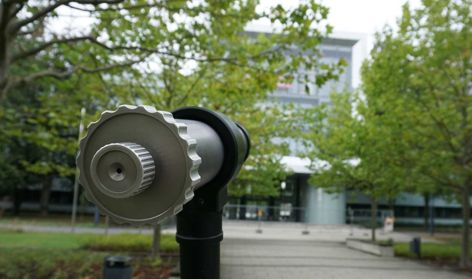 Bild-Nr. e0249430: Kein Wandbild, aber untrennbar mit einem Wandbild verbunden - das Kaleidoskop des Künstlers Christian Eiser. Das im Jahre 2001 starr installierte Kaleidoskop war auf das Wanbild von Fritz Eisel (Bild-Nr. e0140442 - Bild oben) ausgerichtet. Sah man bis Anfang Februar 2006 durch dieses "Fernrohr", so erlebte man wie sich die strengen Linien und die penibel ausgerechneten Raumeinteilungen des Bildes (wie sie bei den Arbeiten des Sozialistischen Realismus dominierend waren), mehrfach in einem Feuerwerk von Farben und Formen brachen. Eine frische und überaschende Sicht junger Kunst auf die Altvorderen. Leider ist das Kaleidoskop seiner Funktion teilweise beraubt (das angesprochene Wandbild gibt es nicht mehr), zumal die Bäume die neue Sicht auf die jetzige Glas-Stahl-Architektur verhindern und somit eine neuen Entsprechung schwierig macht... schade. / Material: Stahl, Edelstahl / Maße: Ø 9 cm, 130 x 46 cm / Standort: BTU Cottbus-Senftenberg, vor dem Hauptgebäude in Richtung Karl-Marx-Straße