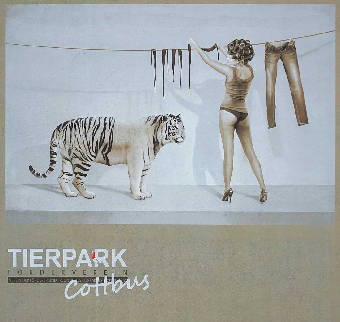 Bild-Nr. 009d000943: Meinhard Bärmich - ein Urgestein der Cottbuser Illustrator-Szene -schuf Mitter der 1980iger Jahre diese Serie mit der freundlichen und augenzwikernden Auffordrung an den Betrachter, wieder einmal den Tierpark zu besuchen. Leider gab es diese Serie in der Bahnhofstraße nicht sehr lange. Kurz vor dem Neubau des Arbeitsamtes wurden die Arbeiten vernichtet. Das Bild wurde Anfang der 90er Jahre aufgenommen, damals noch auf analogem Filmmaterial