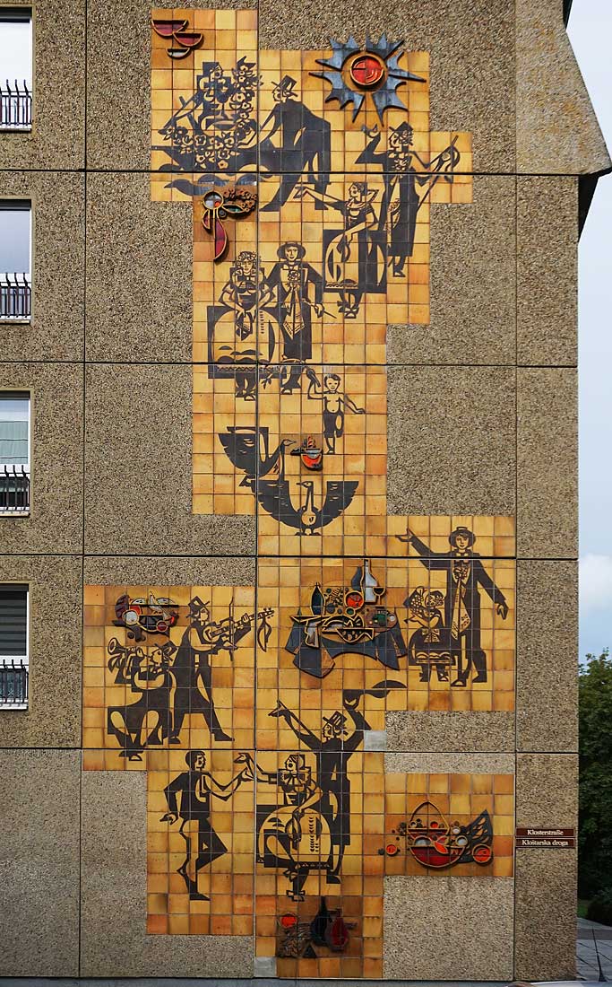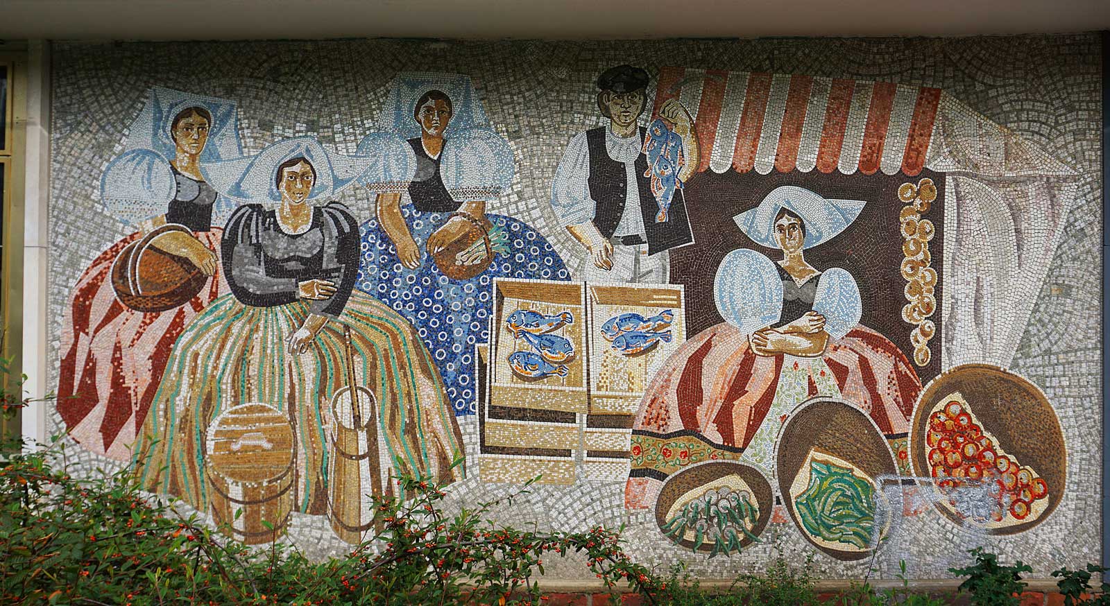 Wandmosaik "Sorbischen Marktszene" von Dieter Dreßler an der Gaststätte „Am Stadttor“ in der Cottbuser Stadtpromenade (1972)