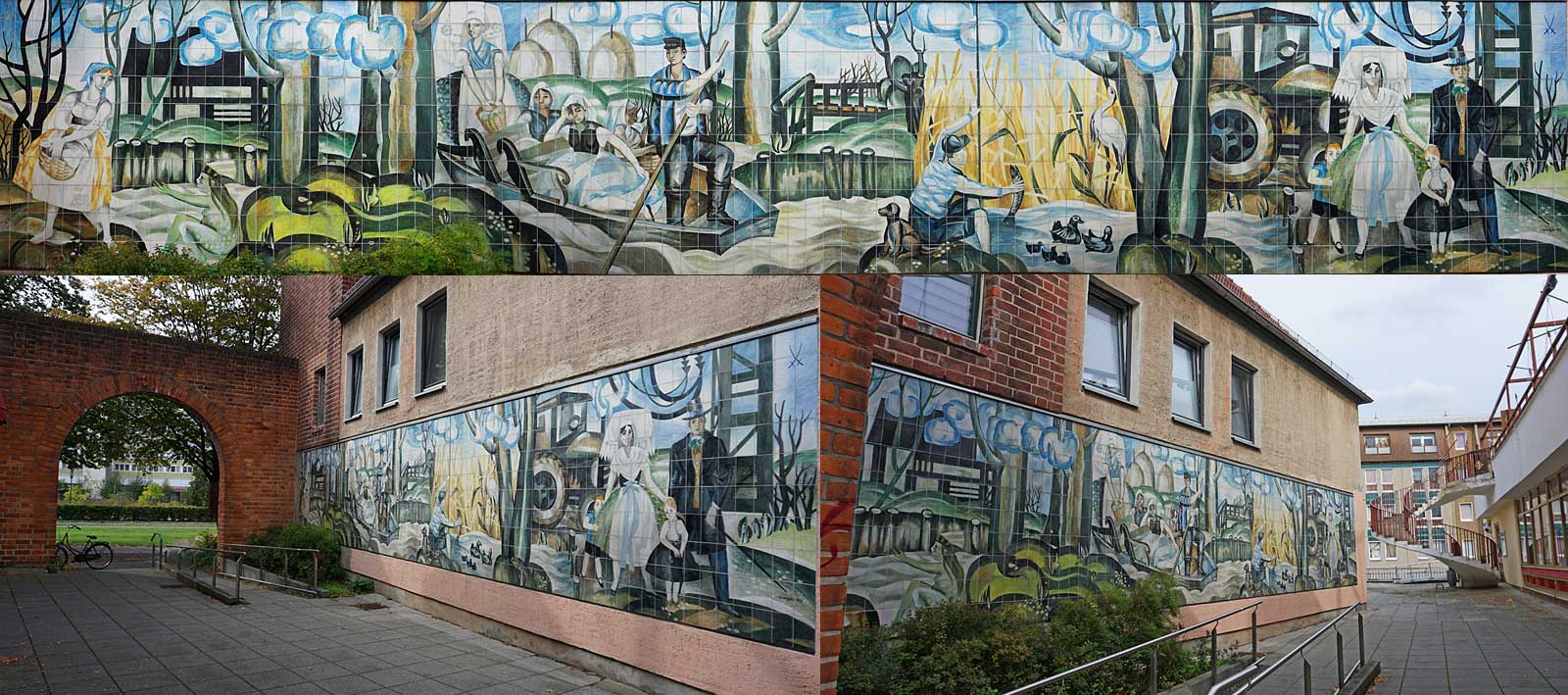 "Aus dem Spreewald", Wandbild von Kurt Heinz Sieger (* 17. April 1917 in Görlitz; † 25. März 2002 in Zempin auf Usedom) aus dem Jahre 1969. Das Bild ist in der Porzellanmanufaktur Meißen im Bereich künstlerische Entwicklung (Bereich Wandgestaltung) vorproduziert worden. Leiter der Abteilung war damals Gerhard Schanze. Das Bild wurde auf edlem Porzellan mit sehr langlebigen Farben (Inglasurfarben, Unterglasurfarben und Mattglasurfarben) gemalt. Rechts oben erkennt man die edle Herkunft: Dort befinden sich die Blauen Schwerter, das international bekannte Logo der Porzellanmanufaktur Meißen. Der bekannte Künstler Arno Rink setzte sich Anfang 2000 für die Sanierung des Bildes ein, die wenig später umgesezt wurde. Dabei reinigte man das Bild gründlich und ersetzte defekte Fließen. Signatur: rechts unten.