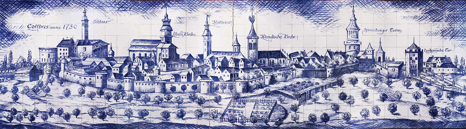 "Cottbus" nach einem alten Stich aus dem 17. Jahrhundert, Wandbild von Kurt Heinz Sieger, Delfter Blau auf Meißener Porzellan (1972), Signatur unten rechts (2.Kachel von rechts), Siegel Meißener Porzellan-Manufaktur oben rechts
