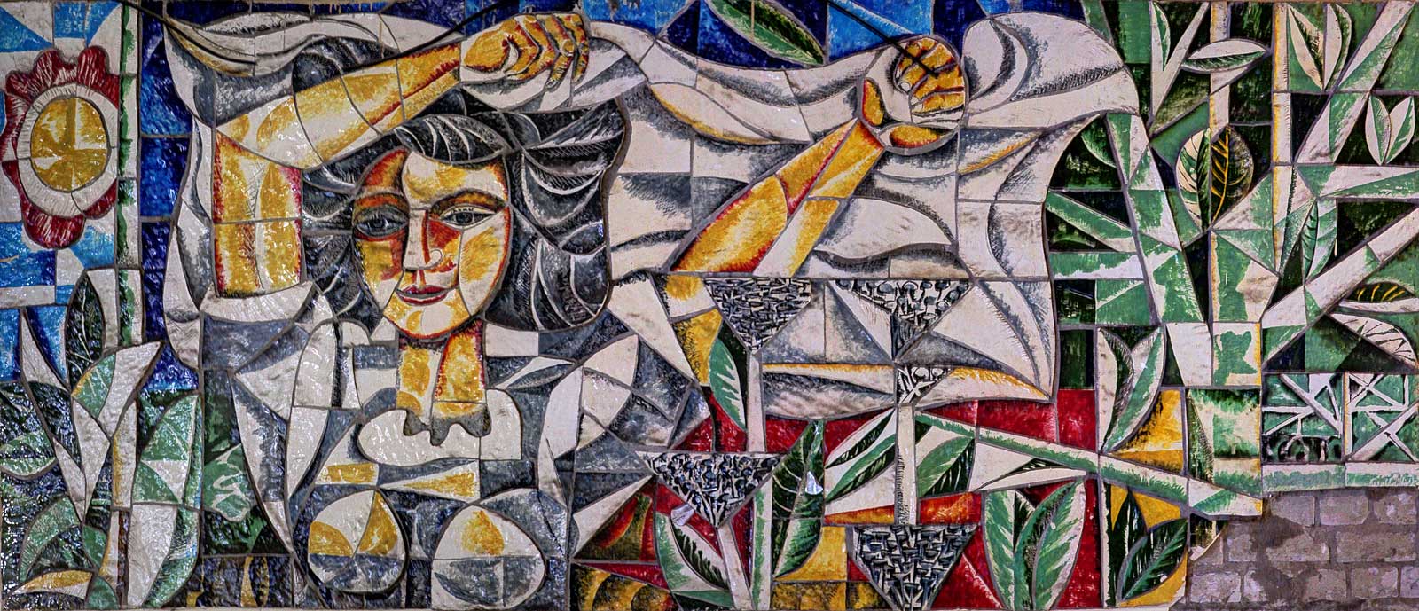 Wandmosaik "Große Wäsche" von Rudolf Sitte, Entstehungsjahr 1960, Foyer des Verwaltungsgebäudes des ehemaligen VEB Textilreinigung Cottbus, Merzdorfer Weg. Das Bild war 2017 schon arg ramponiert gewesen.
