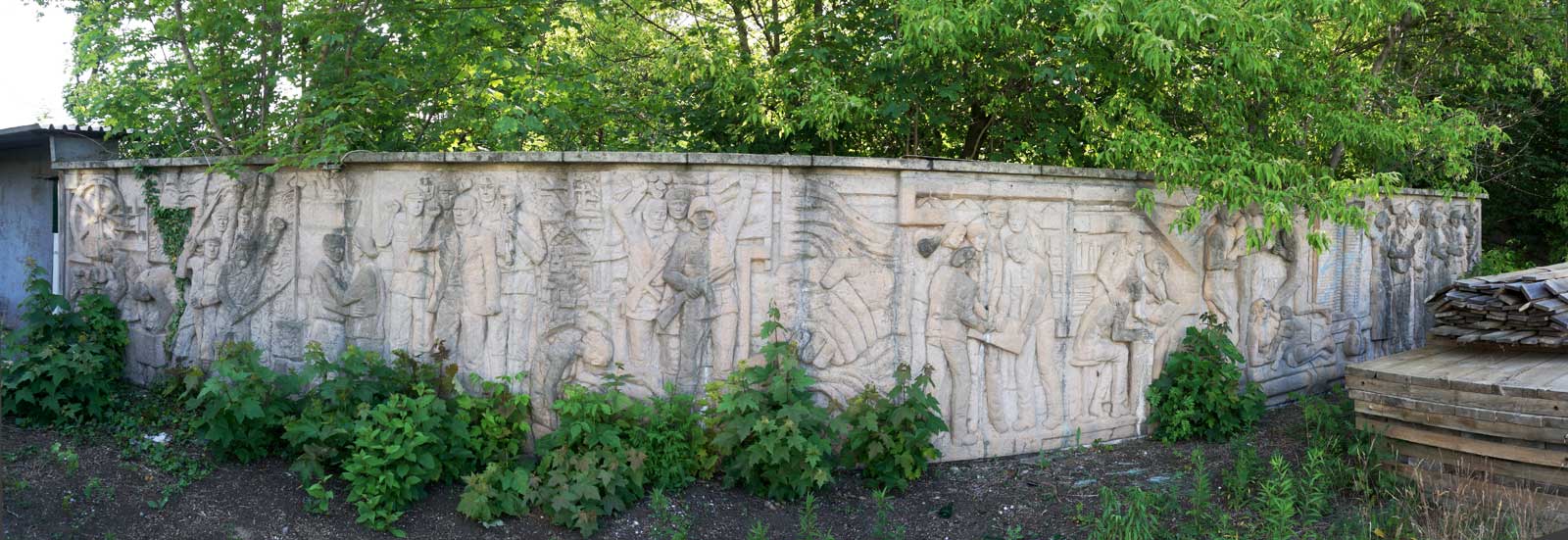 Wandrelief auf dem Gelände des ehemaligen Textilkombinate Cottbus (TKC) "Alles für das Wohl des Volkes" von Johannes Peschel, Entstehugsjahr 1975