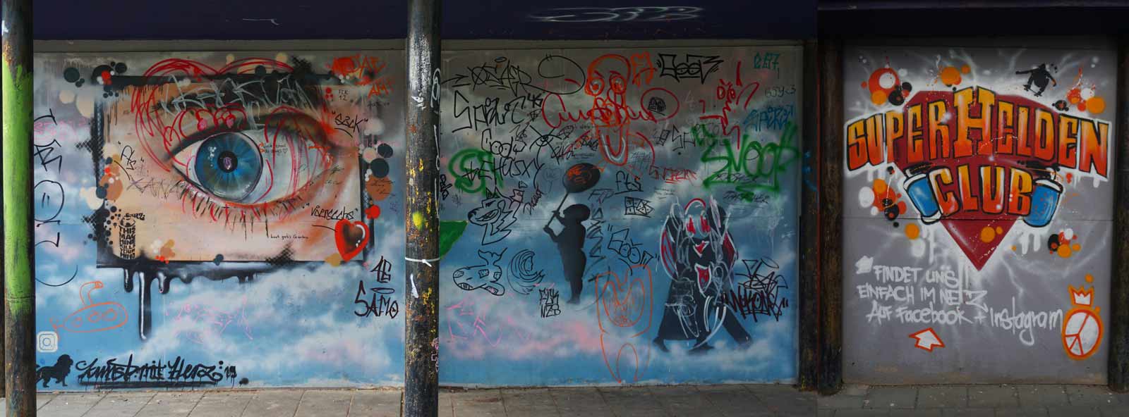 Sie ist einfach da, manchmal unbemerkt, oft temporär, machmal außergewöhlich und hin und wieder nah am Kitsch: Kunst im öffentlichen Raum. Sie ist ein Spiegel einer jeden gelebten Epoche der Gesellschaft und damit wertvoll und erhaltenswert. Grund genug, um ins Archiv zu gehen und diese Zusammenstellung zu zeigen. Es handelt sich hier nicht um eine vollständige und geordnete Auswahl an Wandbildern - vielmehr soll hier die Vielfalt der kreativen Arbeiten gezeigt werden - unabhängig vom Wert und der Einordnung für die Kulturgeschichte. Nicht bei allen Arbeiten konnten Urheber ermittelt und zusätzliche Informationen eingeholt werden. Sollte jemand sich und seine Arbeiten wiedererkennen, bin ich sehr dankbar, wenn sich dieser bei mir meldet. Die Kontaktdaten stehen im Impressum dieser Website.