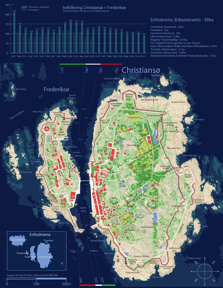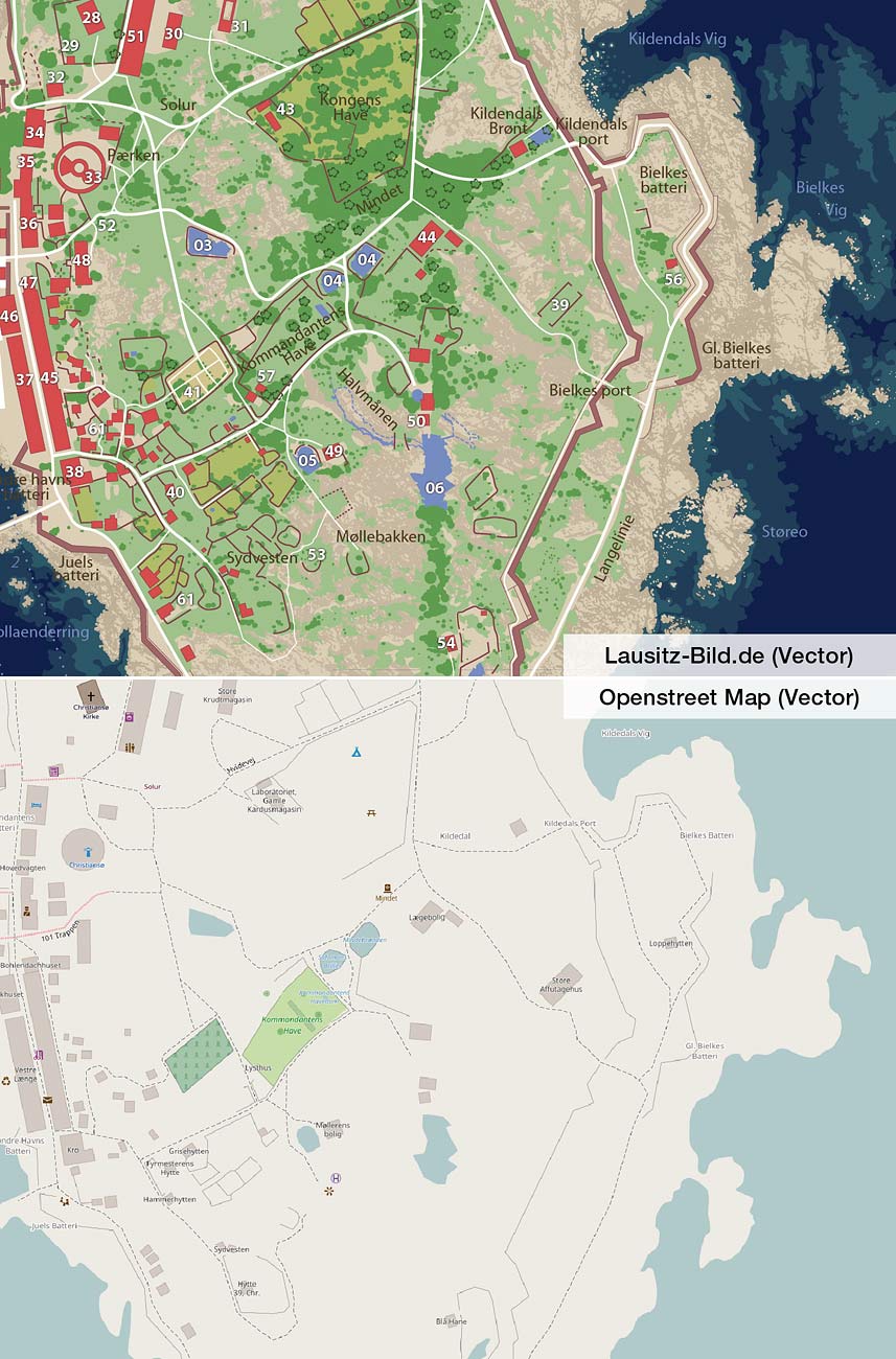 Dennoch: gegenwärtig setzen viele kleine Regionen auf Touristik und wollen Besucher und Sehenswürdigkeiten zusammenbringen. Da ist es mit einer Karte, die nur reine Grund-Information beinhaltet, nicht getan. Es werden wieder mehr Maps nachgefragt, die eine bessere Gestaltung, höhere Informations-Dichte und vor allem regionalen Besonderheiten abbilden. Auf nebenstehenden Bild habe ich mal einen Vergleich aufgezeigt. Dort ist ein kleiner Ausschnitt einer winzigen Inselgruppe (Dänemark`s Erbsen-Inseln in der Ostsee) zu sehen. Einmal in der Version Openstreet-Map (für die wenigen hundert Meter Areal schon sehr detailliert - Google ist da wesentlich spartanischer) und in einer Version von mir/Lausitz Bild.de: obwohl beide Karten im Datei-Größen minimierenden Vektor-Format erstellt wurden (stufenlos und verlustfrei skalierbar), habe ich in meiner Karte weit mehr Informationen unterbringen können, die den Charakter der Insel(n) weitaus besser beschreiben als dies bei der Open-Street-Map der Fall ist. Man sieht die zerklüftete Küstenlinie viel detaillierter (bspw. Kopfinfo: baden ist dort schwierig) historische Gemäuer sind zu 98% abgebildet und auch alte Flurnamen (die oft etwas über den Ort aussagen) aufgeführt. Man kann niederen und höheren Bewuchs Baum-genau unterscheiden und sogar die geologische Faltung der Inseln erkennen. Eine Möglichkeit für eine touristische Anwendung können Sie auf meiner alten Website abrufen.